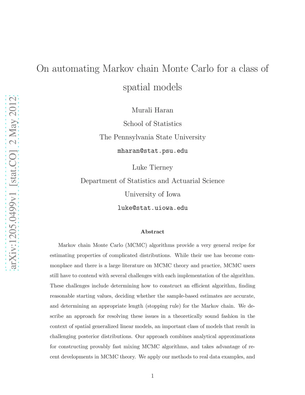Markov chain Monte Carlo (MCMC) algorithms provide a very general recipe for estimating properties of complicated distributions. While their use has become commonplace and there is a large literature on MCMC theory and practice, MCMC users still have to contend with several challenges with each implementation of the algorithm. These challenges include determining how to construct an efficient algorithm, finding reasonable starting values, deciding whether the sample-based estimates are accurate, and determining an appropriate length (stopping rule) for the Markov chain. We describe an approach for resolving these issues in a theoretically sound fashion in the context of spatial generalized linear models, an important class of models that result in challenging posterior distributions. Our approach combines analytical approximations for constructing provably fast mixing MCMC algorithms, and takes advantage of recent developments in MCMC theory. We apply our methods to real data examples, and find that our MCMC algorithm is automated and efficient. Furthermore, since starting values, rigorous error estimates and theoretically justified stopping rules for the sampling algorithm are all easily obtained for our examples, our MCMC-based estimation is practically as easy to perform as Monte Carlo estimation based on independent and identically distributed draws.
