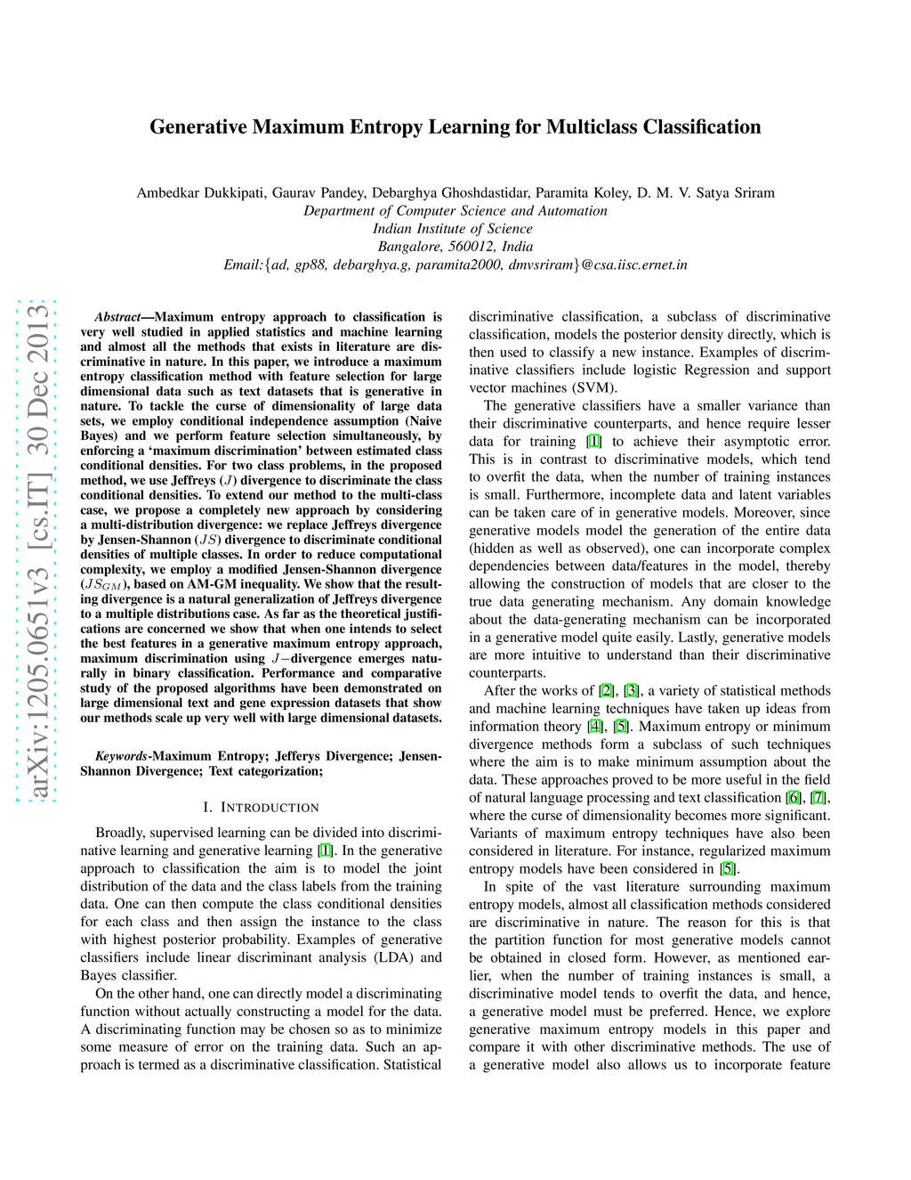 Maximum entropy approach to classification is very well studied in applied statistics and machine learning and almost all the methods that exists in literature are discriminative in nature. In this paper, we introduce a maximum entropy classification method with feature selection for large dimensional data such as text datasets that is generative in nature. To tackle the curse of dimensionality of large data sets, we employ conditional independence assumption (Naive Bayes) and we perform feature selection simultaneously, by enforcing a `maximum discrimination' between estimated class conditional densities. For two class problems, in the proposed method, we use Jeffreys () divergence to discriminate the class conditional densities. To extend our method to the multi-class case, we propose a completely new approach by considering a multi-distribution divergence: we replace Jeffreys divergence by Jensen-Shannon () divergence to discriminate conditional densities of multiple classes. In order to reduce computational complexity, we employ a modified Jensen-Shannon divergence (), based on AM-GM inequality. We show that the resulting divergence is a natural generalization of Jeffreys divergence to a multiple distributions case. As far as the theoretical justifications are concerned we show that when one intends to select the best features in a generative maximum entropy approach, maximum discrimination using divergence emerges naturally in binary classification. Performance and comparative study of the proposed algorithms have been demonstrated on large dimensional text and gene expression datasets that show our methods scale up very well with large dimensional datasets.