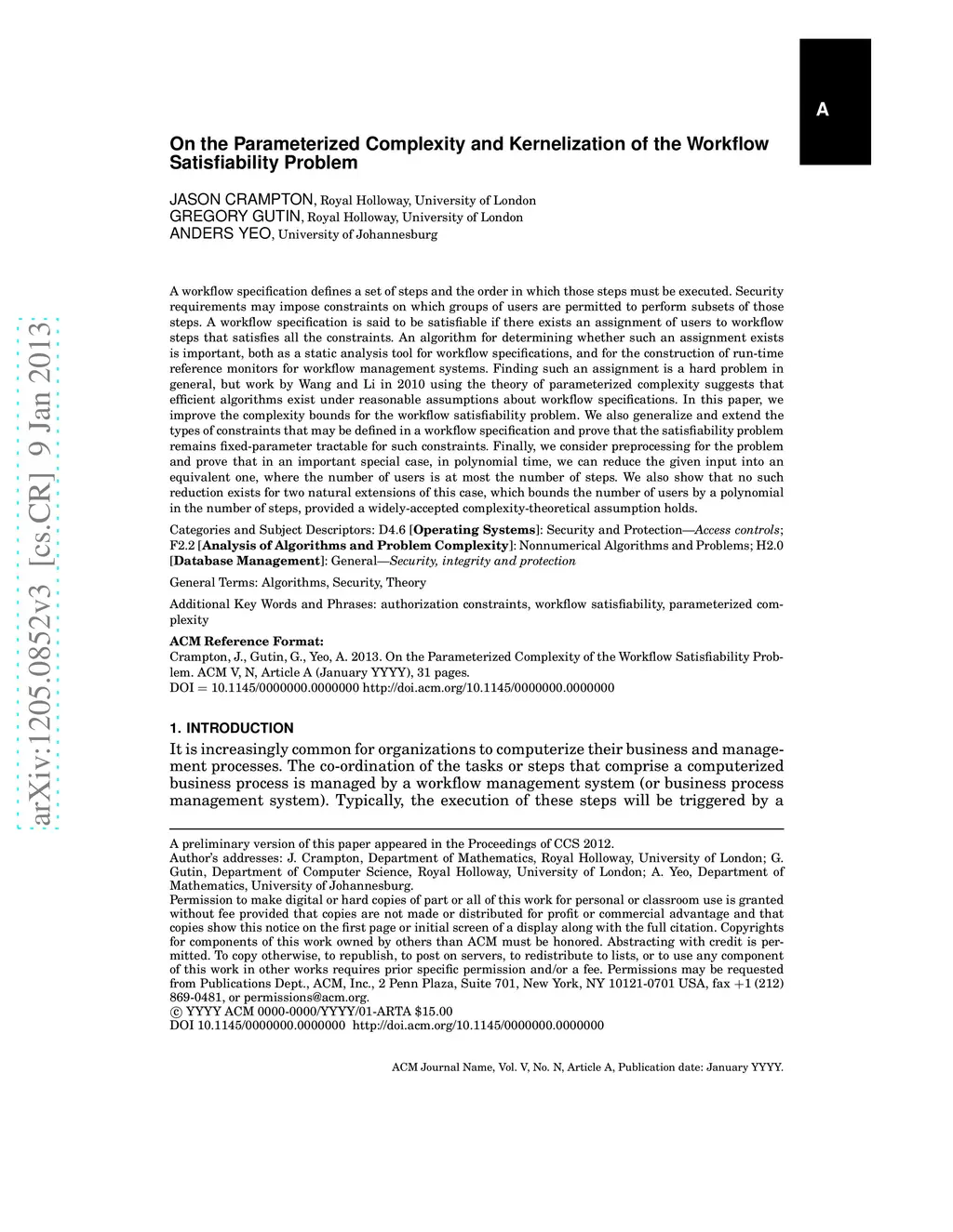 A workflow specification defines a set of steps and the order in which those steps must be executed. Security requirements may impose constraints on which groups of users are permitted to perform subsets of those steps. A workflow specification is said to be satisfiable if there exists an assignment of users to workflow steps that satisfies all the constraints. An algorithm for determining whether such an assignment exists is important, both as a static analysis tool for workflow specifications, and for the construction of run-time reference monitors for workflow management systems. Finding such an assignment is a hard problem in general, but work by Wang and Li in 2010 using the theory of parameterized complexity suggests that efficient algorithms exist under reasonable assumptions about workflow specifications. In this paper, we improve the complexity bounds for the workflow satisfiability problem. We also generalize and extend the types of constraints that may be defined in a workflow specification and prove that the satisfiability problem remains fixed-parameter tractable for such constraints. Finally, we consider preprocessing for the problem and prove that in an important special case, in polynomial time, we can reduce the given input into an equivalent one, where the number of users is at most the number of steps. We also show that no such reduction exists for two natural extensions of this case, which bounds the number of users by a polynomial in the number of steps, provided a widely-accepted complexity-theoretical assumption holds.