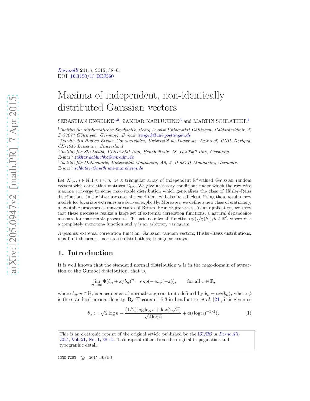Let , be a triangular array of independent -valued Gaussian random vectors with correlation matrices . We give necessary conditions under which the row-wise maxima converge to some max-stable distribution which generalizes the class of H\"{u}sler-Reiss distributions. In the bivariate case, the conditions will also be sufficient. Using these results, new models for bivariate extremes are derived explicitly. Moreover, we define a new class of stationary, max-stable processes as max-mixtures of Brown-Resnick processes. As an application, we show that these processes realize a large set of extremal correlation functions, a natural dependence measure for max-stable processes. This set includes all functions , where is a completely monotone function and is an arbitrary variogram.