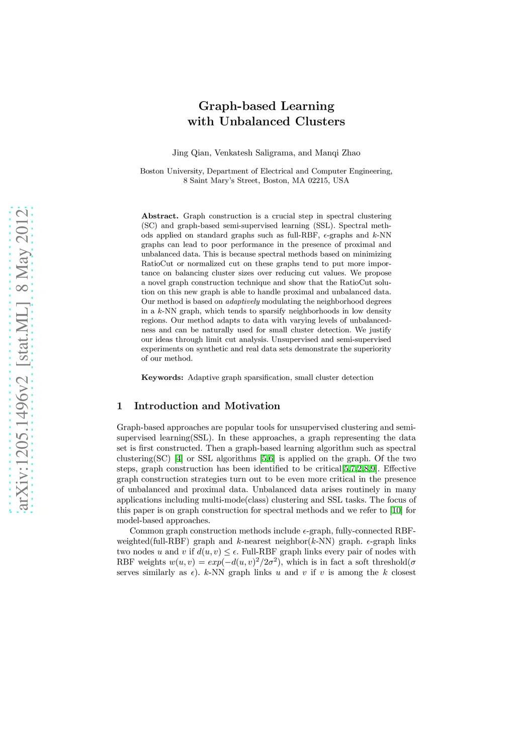 Graph construction is a crucial step in spectral clustering (SC) and graph-based semi-supervised learning (SSL). Spectral methods applied on standard graphs such as full-RBF, -graphs and -NN graphs can lead to poor performance in the presence of proximal and unbalanced data. This is because spectral methods based on minimizing RatioCut or normalized cut on these graphs tend to put more importance on balancing cluster sizes over reducing cut values. We propose a novel graph construction technique and show that the RatioCut solution on this new graph is able to handle proximal and unbalanced data. Our method is based on adaptively modulating the neighborhood degrees in a -NN graph, which tends to sparsify neighborhoods in low density regions. Our method adapts to data with varying levels of unbalancedness and can be naturally used for small cluster detection. We justify our ideas through limit cut analysis. Unsupervised and semi-supervised experiments on synthetic and real data sets demonstrate the superiority of our method.