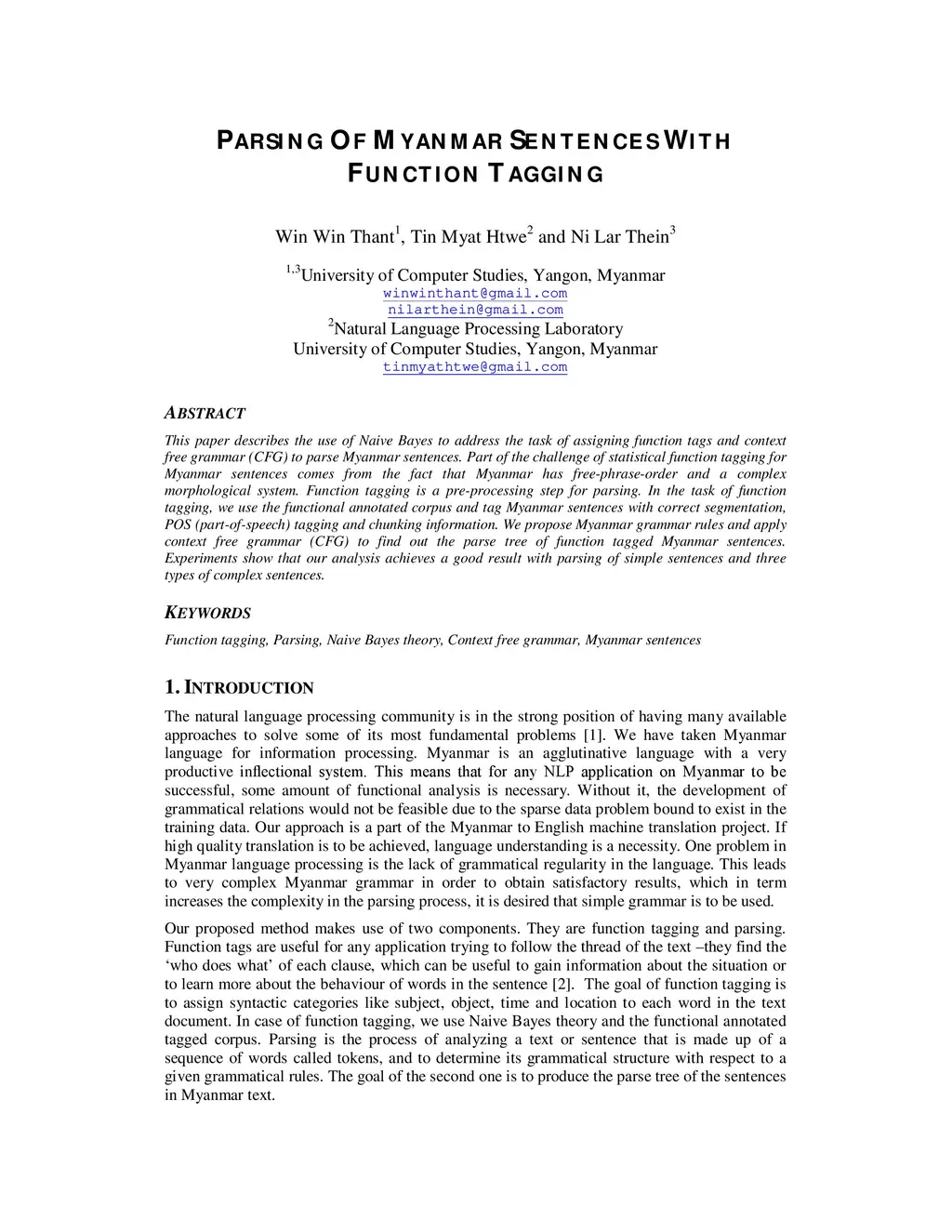 This paper describes the use of Naive Bayes to address the task of assigning function tags and context free grammar (CFG) to parse Myanmar sentences. Part of the challenge of statistical function tagging for Myanmar sentences comes from the fact that Myanmar has free-phrase-order and a complex morphological system. Function tagging is a pre-processing step for parsing. In the task of function tagging, we use the functional annotated corpus and tag Myanmar sentences with correct segmentation, POS (part-of-speech) tagging and chunking information. We propose Myanmar grammar rules and apply context free grammar (CFG) to find out the parse tree of function tagged Myanmar sentences. Experiments show that our analysis achieves a good result with parsing of simple sentences and three types of complex sentences.
