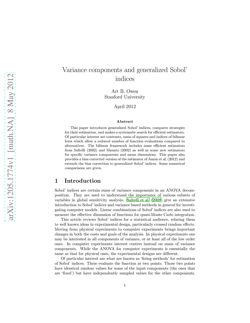 This paper introduces generalized Sobol' indices, compares strategies for their estimation, and makes a systematic search for efficient estimators. Of particular interest are contrasts, sums of squares and indices of bilinear form which allow a reduced number of function evaluations compared to alternatives. The bilinear framework includes some efficient estimators from Saltelli (2002) and Mauntz (2002) as well as some new estimators for specific variance components and mean dimensions. This paper also provides a bias corrected version of the estimator of Janon et al.\,(2012) and extends the bias correction to generalized Sobol' indices. Some numerical comparisons are given.