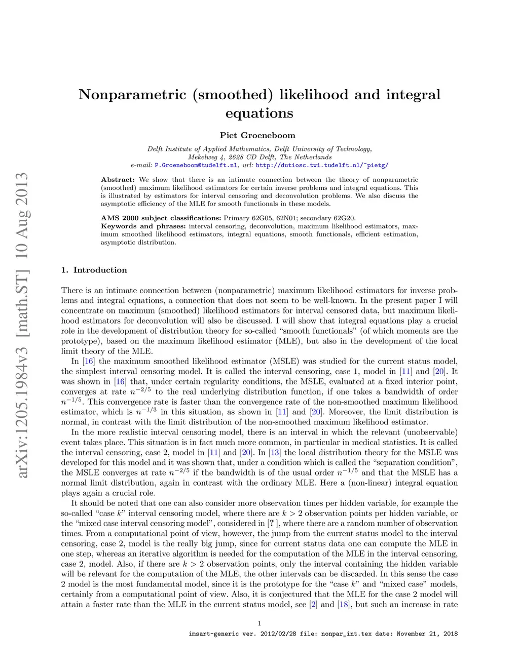 We show that there is an intimate connection between the theory of nonparametric (smoothed) maximum likelihood estimators for certain inverse problems and integral equations. This is illustrated by estimators for interval censoring and deconvolution problems. We also discuss the asymptotic efficiency of the MLE for smooth functionals in these models.