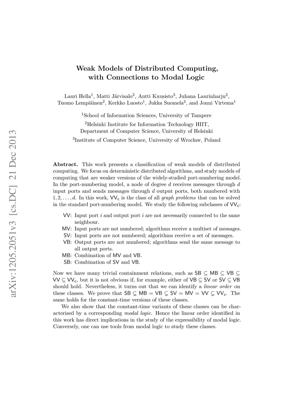 This work presents a classification of weak models of distributed computing. We focus on deterministic distributed algorithms, and study models of computing that are weaker versions of the widely-studied port-numbering model. In the port-numbering model, a node of degree d receives messages through d input ports and sends messages through d output ports, both numbered with 1,2,...,d. In this work, VVc is the class of all graph problems that can be solved in the standard port-numbering model. We study the following subclasses of VVc: VV: Input port i and output port i are not necessarily connected to the same neighbour. MV: Input ports are not numbered; algorithms receive a multiset of messages. SV: Input ports are not numbered; algorithms receive a set of messages. VB: Output ports are not numbered; algorithms send the same message to all output ports. MB: Combination of MV and VB. SB: Combination of SV and VB. Now we have many trivial containment relations, such as SB \subseteq MB \subseteq VB \subseteq VV \subseteq VVc, but it is not obvious if, for example, either of VB \subseteq SV or SV \subseteq VB should hold. Nevertheless, it turns out that we can identify a linear order on these classes. We prove that SB \subsetneq MB = VB \subsetneq SV = MV = VV \subsetneq VVc. The same holds for the constant-time versions of these classes. We also show that the constant-time variants of these classes can be characterised by a corresponding modal logic. Hence the linear order identified in this work has direct implications in the study of the expressibility of modal logic. Conversely, one can use tools from modal logic to study these classes.