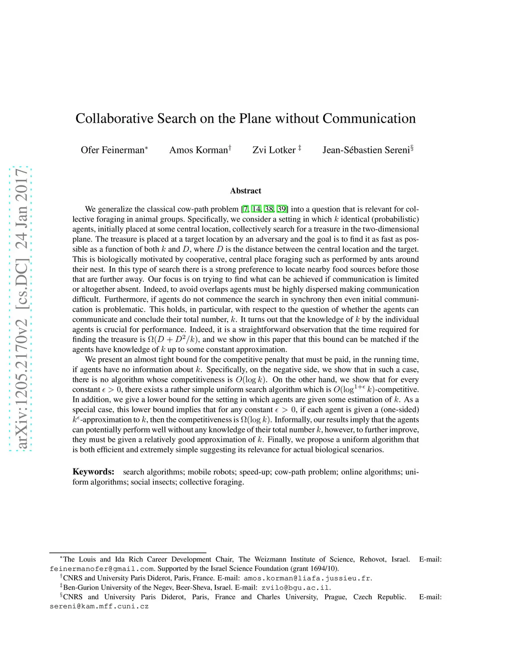 We generalize the classical cow-path problem [7, 14, 38, 39] into a question that is relevant for collective foraging in animal groups. Specifically, we consider a setting in which k identical (probabilistic) agents, initially placed at some central location, collectively search for a treasure in the two-dimensional plane. The treasure is placed at a target location by an adversary and the goal is to find it as fast as possible as a function of both k and D, where D is the distance between the central location and the target. This is biologically motivated by cooperative, central place foraging such as performed by ants around their nest. In this type of search there is a strong preference to locate nearby food sources before those that are further away. Our focus is on trying to find what can be achieved if communication is limited or altogether absent. Indeed, to avoid overlaps agents must be highly dispersed making communication difficult. Furthermore, if agents do not commence the search in synchrony then even initial communication is problematic. This holds, in particular, with respect to the question of whether the agents can communicate and conclude their total number, k. It turns out that the knowledge of k by the individual agents is crucial for performance. Indeed, it is a straightforward observation that the time required for finding the treasure is (D + D 2 /k), and we show in this paper that this bound can be matched if the agents have knowledge of k up to some constant approximation. We present an almost tight bound for the competitive penalty that must be paid, in the running time, if agents have no information about k. Specifically, on the negative side, we show that in such a case, there is no algorithm whose competitiveness is O(log k). On the other hand, we show that for every constant , there exists a rather simple uniform search algorithm which is -competitive. In addition, we give a lower bound for the setting in which agents are given some estimation of k. As a special case, this lower bound implies that for any constant , if each agent is given a (one-sided) -approximation to k, then the competitiveness is (log k). Informally, our results imply that the agents can potentially perform well without any knowledge of their total number k, however, to further improve, they must be given a relatively good approximation of k. Finally, we propose a uniform algorithm that is both efficient and extremely simple suggesting its relevance for actual biological scenarios.