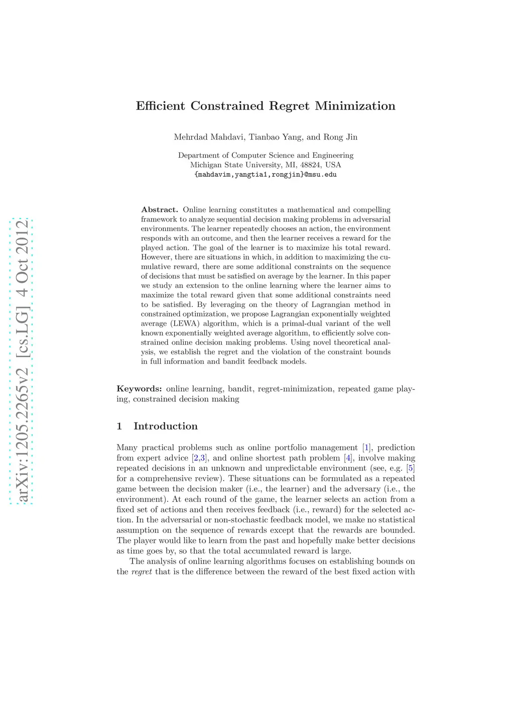 Online learning constitutes a mathematical and compelling framework to analyze sequential decision making problems in adversarial environments. The learner repeatedly chooses an action, the environment responds with an outcome, and then the learner receives a reward for the played action. The goal of the learner is to maximize his total reward. However, there are situations in which, in addition to maximizing the cumulative reward, there are some additional constraints on the sequence of decisions that must be satisfied on average by the learner. In this paper we study an extension to the online learning where the learner aims to maximize the total reward given that some additional constraints need to be satisfied. By leveraging on the theory of Lagrangian method in constrained optimization, we propose Lagrangian exponentially weighted average (LEWA) algorithm, which is a primal-dual variant of the well known exponentially weighted average algorithm, to efficiently solve constrained online decision making problems. Using novel theoretical analysis, we establish the regret and the violation of the constraint bounds in full information and bandit feedback models.