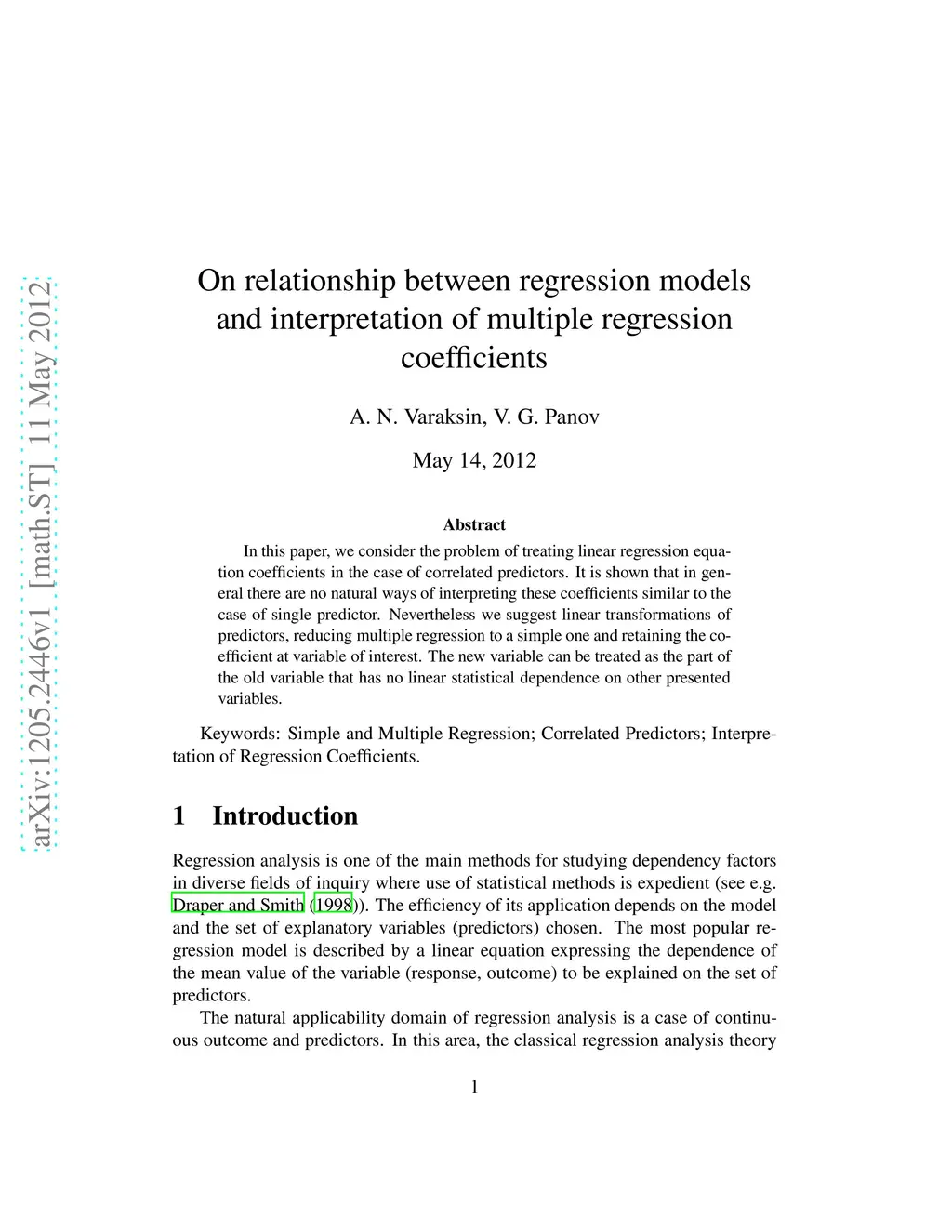 In this paper, we consider the problem of treating linear regression equation coefficients in the case of correlated predictors. It is shown that in general there are no natural ways of interpreting these coefficients similar to the case of single predictor. Nevertheless we suggest linear transformations of predictors, reducing multiple regression to a simple one and retaining the coefficient at variable of interest. The new variable can be treated as the part of the old variable that has no linear statistical dependence on other presented variables.
