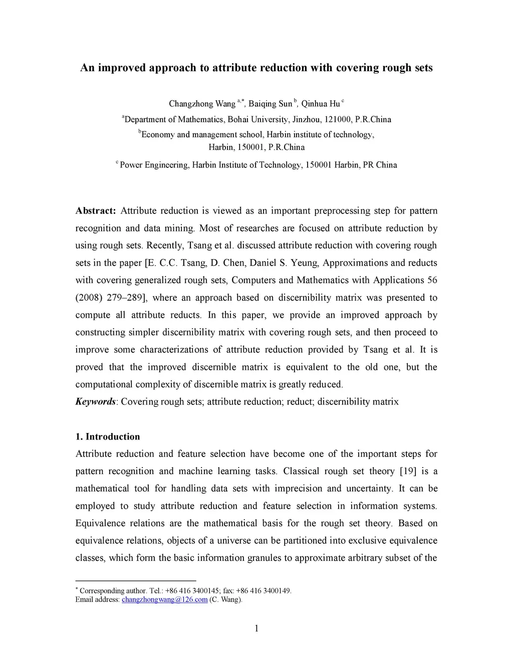 Attribute reduction is viewed as an important preprocessing step for pattern recognition and data mining. Most of researches are focused on attribute reduction by using rough sets. Recently, Tsang et al. discussed attribute reduction with covering rough sets in the paper [E. C.C. Tsang, D. Chen, Daniel S. Yeung, Approximations and reducts with covering generalized rough sets, Computers and Mathematics with Applications 56 (2008) 279-289], where an approach based on discernibility matrix was presented to compute all attribute reducts. In this paper, we provide an improved approach by constructing simpler discernibility matrix with covering rough sets, and then proceed to improve some characterizations of attribute reduction provided by Tsang et al. It is proved that the improved discernible matrix is equivalent to the old one, but the computational complexity of discernible matrix is greatly reduced.