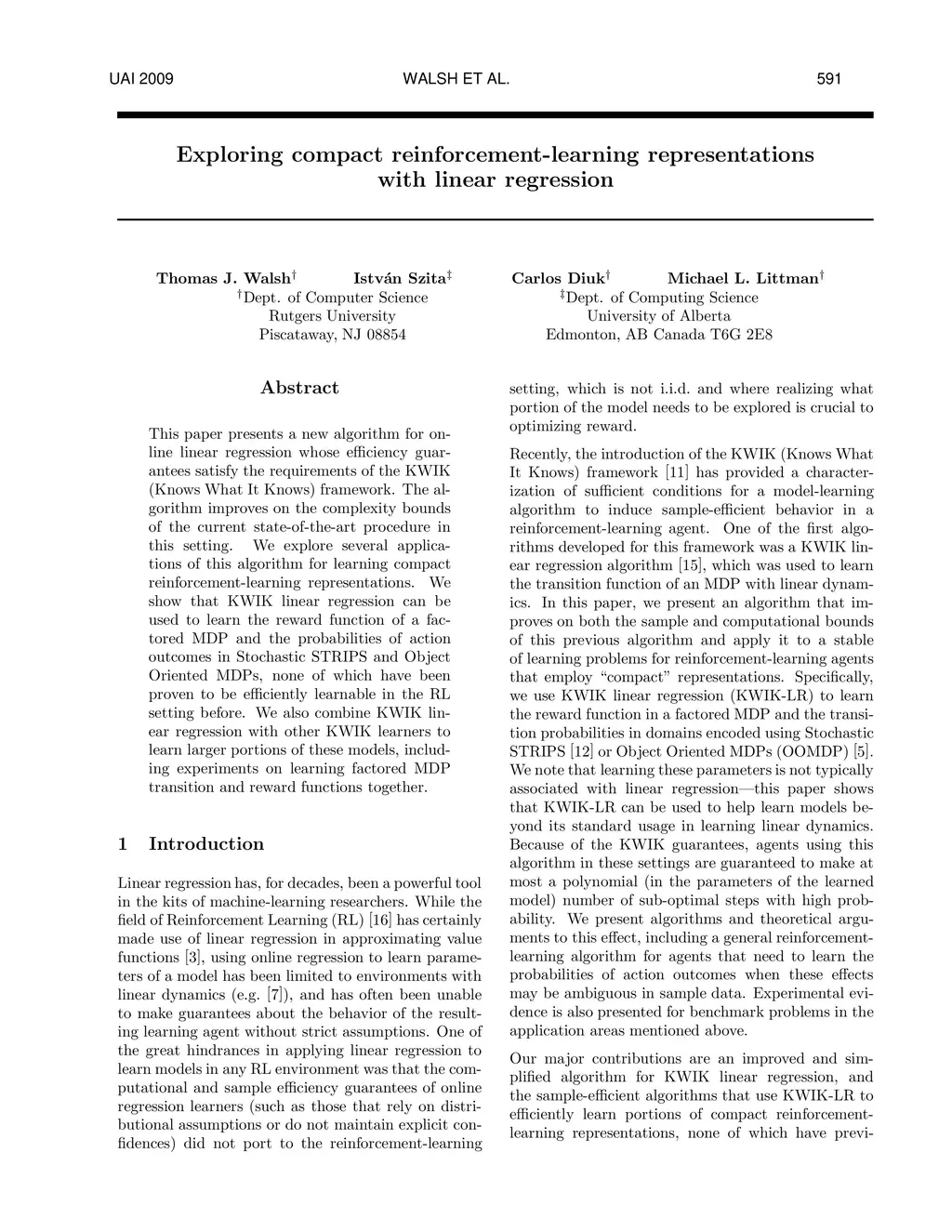 This paper presents a new algorithm for online linear regression whose efficiency guarantees satisfy the requirements of the KWIK (Knows What It Knows) framework. The algorithm improves on the complexity bounds of the current state-of-the-art procedure in this setting. We explore several applications of this algorithm for learning compact reinforcement-learning representations. We show that KWIK linear regression can be used to learn the reward function of a factored MDP and the probabilities of action outcomes in Stochastic STRIPS and Object Oriented MDPs, none of which have been proven to be efficiently learnable in the RL setting before. We also combine KWIK linear regression with other KWIK learners to learn larger portions of these models, including experiments on learning factored MDP transition and reward functions together.