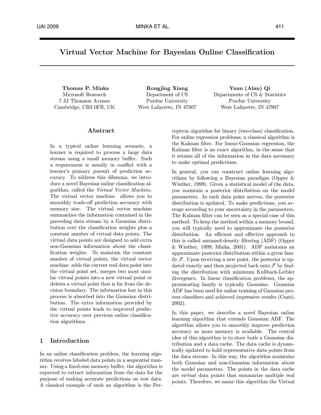In a typical online learning scenario, a learner is required to process a large data stream using a small memory buffer. Such a requirement is usually in conflict with a learner's primary pursuit of prediction accuracy. To address this dilemma, we introduce a novel Bayesian online classi cation algorithm, called the Virtual Vector Machine. The virtual vector machine allows you to smoothly trade-off prediction accuracy with memory size. The virtual vector machine summarizes the information contained in the preceding data stream by a Gaussian distribution over the classi cation weights plus a constant number of virtual data points. The virtual data points are designed to add extra non-Gaussian information about the classi cation weights. To maintain the constant number of virtual points, the virtual vector machine adds the current real data point into the virtual point set, merges two most similar virtual points into a new virtual point or deletes a virtual point that is far from the decision boundary. The information lost in this process is absorbed into the Gaussian distribution. The extra information provided by the virtual points leads to improved predictive accuracy over previous online classification algorithms.