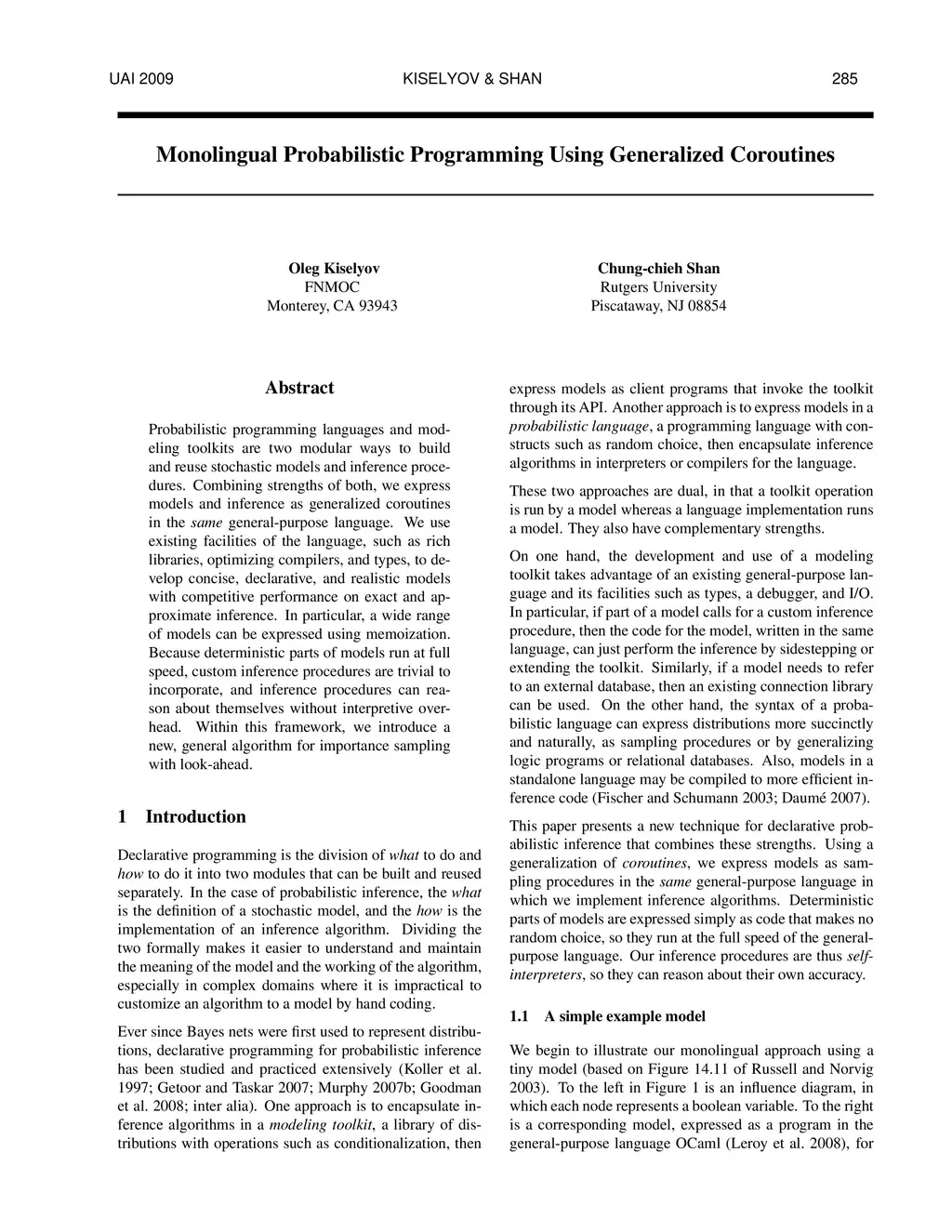 Probabilistic programming languages and modeling toolkits are two modular ways to build and reuse stochastic models and inference procedures. Combining strengths of both, we express models and inference as generalized coroutines in the same general-purpose language. We use existing facilities of the language, such as rich libraries, optimizing compilers, and types, to develop concise, declarative, and realistic models with competitive performance on exact and approximate inference. In particular, a wide range of models can be expressed using memoization. Because deterministic parts of models run at full speed, custom inference procedures are trivial to incorporate, and inference procedures can reason about themselves without interpretive overhead. Within this framework, we introduce a new, general algorithm for importance sampling with look-ahead.