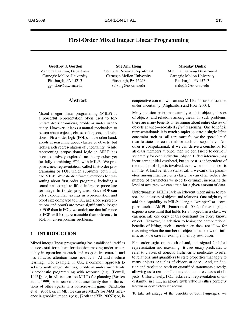 Mixed integer linear programming (MILP) is a powerful representation often used to formulate decision-making problems under uncertainty. However, it lacks a natural mechanism to reason about objects, classes of objects, and relations. First-order logic (FOL), on the other hand, excels at reasoning about classes of objects, but lacks a rich representation of uncertainty. While representing propositional logic in MILP has been extensively explored, no theory exists yet for fully combining FOL with MILP. We propose a new representation, called first-order programming or FOP, which subsumes both FOL and MILP. We establish formal methods for reasoning about first order programs, including a sound and complete lifted inference procedure for integer first order programs. Since FOP can offer exponential savings in representation and proof size compared to FOL, and since representations and proofs are never significantly longer in FOP than in FOL, we anticipate that inference in FOP will be more tractable than inference in FOL for corresponding problems.