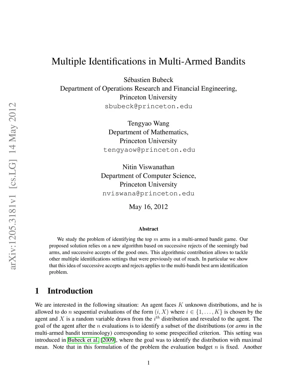 We study the problem of identifying the top arms in a multi-armed bandit game. Our proposed solution relies on a new algorithm based on successive rejects of the seemingly bad arms, and successive accepts of the good ones. This algorithmic contribution allows to tackle other multiple identifications settings that were previously out of reach. In particular we show that this idea of successive accepts and rejects applies to the multi-bandit best arm identification problem.