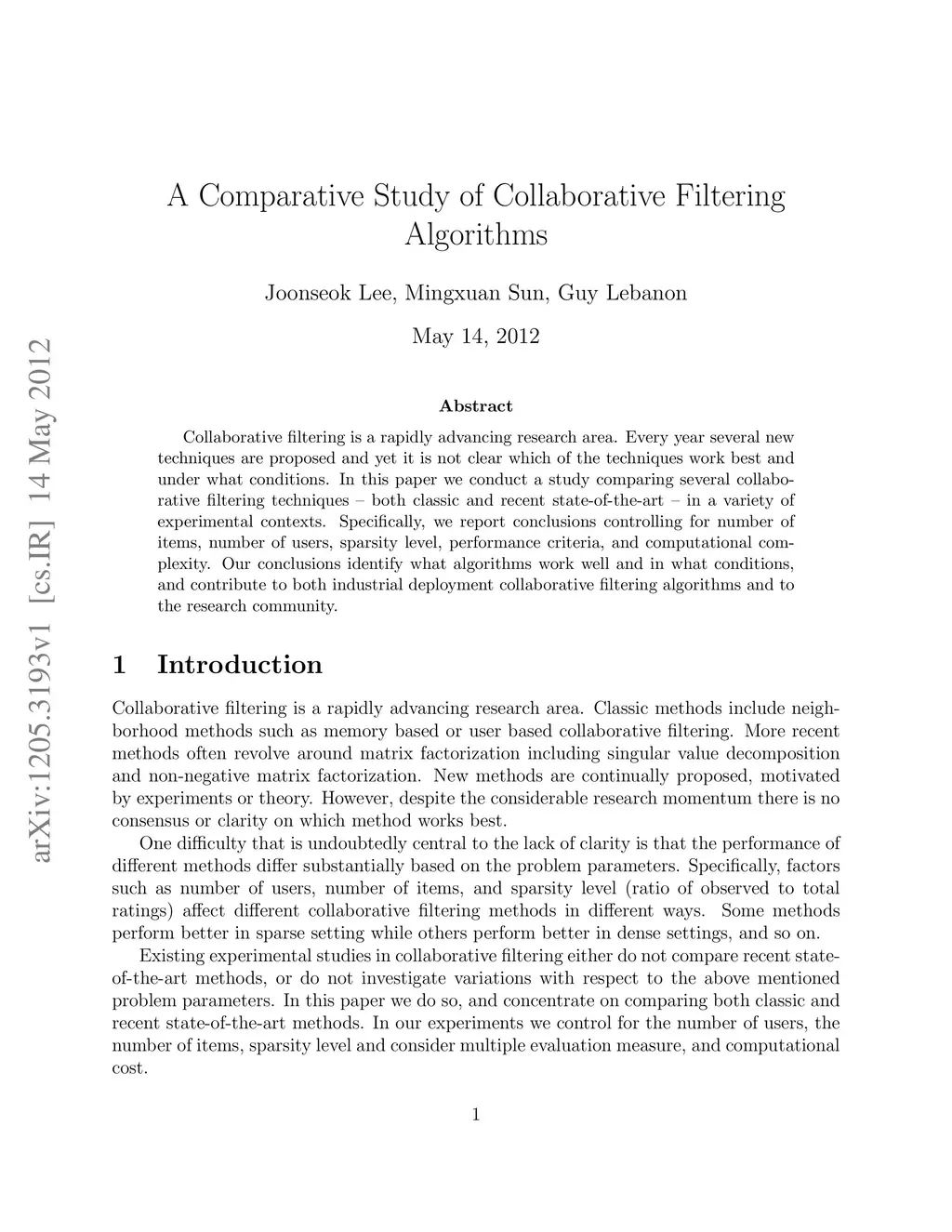 Collaborative filtering is a rapidly advancing research area. Every year several new techniques are proposed and yet it is not clear which of the techniques work best and under what conditions. In this paper we conduct a study comparing several collaborative filtering techniques -- both classic and recent state-of-the-art -- in a variety of experimental contexts. Specifically, we report conclusions controlling for number of items, number of users, sparsity level, performance criteria, and computational complexity. Our conclusions identify what algorithms work well and in what conditions, and contribute to both industrial deployment collaborative filtering algorithms and to the research community.