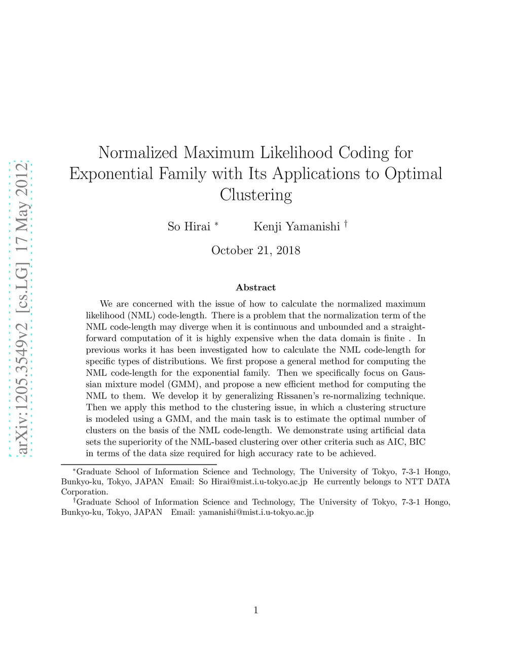 We are concerned with the issue of how to calculate the normalized maximum likelihood (NML) code-length. There is a problem that the normalization term of the NML code-length may diverge when it is continuous and unbounded and a straightforward computation of it is highly expensive when the data domain is finite . In previous works it has been investigated how to calculate the NML code-length for specific types of distributions. We first propose a general method for computing the NML code-length for the exponential family. Then we specifically focus on Gaussian mixture model (GMM), and propose a new efficient method for computing the NML to them. We develop it by generalizing Rissanen's re-normalizing technique. Then we apply this method to the clustering issue, in which a clustering structure is modeled using a GMM, and the main task is to estimate the optimal number of clusters on the basis of the NML code-length. We demonstrate using artificial data sets the superiority of the NML-based clustering over other criteria such as AIC, BIC in terms of the data size required for high accuracy rate to be achieved.
