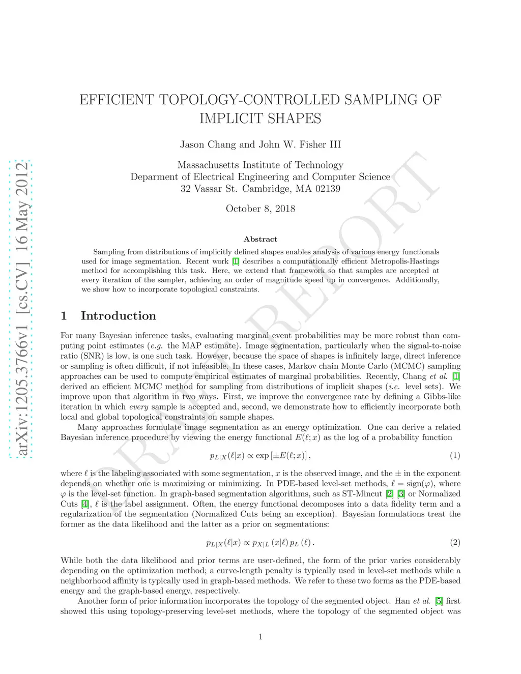 Sampling from distributions of implicitly defined shapes enables analysis of various energy functionals used for image segmentation. Recent work describes a computationally efficient Metropolis-Hastings method for accomplishing this task. Here, we extend that framework so that samples are accepted at every iteration of the sampler, achieving an order of magnitude speed up in convergence. Additionally, we show how to incorporate topological constraints.