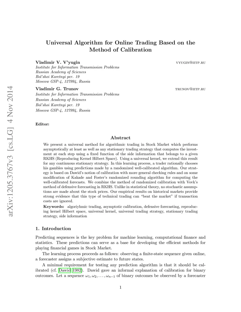 We present a universal algorithm for online trading in Stock Market which performs asymptotically at least as good as any stationary trading strategy that computes the investment at each step using a fixed function of the side information that belongs to a given RKHS (Reproducing Kernel Hilbert Space). Using a universal kernel, we extend this result for any continuous stationary strategy. In this learning process, a trader rationally chooses his gambles using predictions made by a randomized well-calibrated algorithm. Our strategy is based on Dawid's notion of calibration with more general checking rules and on some modification of Kakade and Foster's randomized rounding algorithm for computing the well-calibrated forecasts. We combine the method of randomized calibration with Vovk's method of defensive forecasting in RKHS. Unlike the statistical theory, no stochastic assumptions are made about the stock prices. Our empirical results on historical markets provide strong evidence that this type of technical trading can "beat the market" if transaction costs are ignored.
