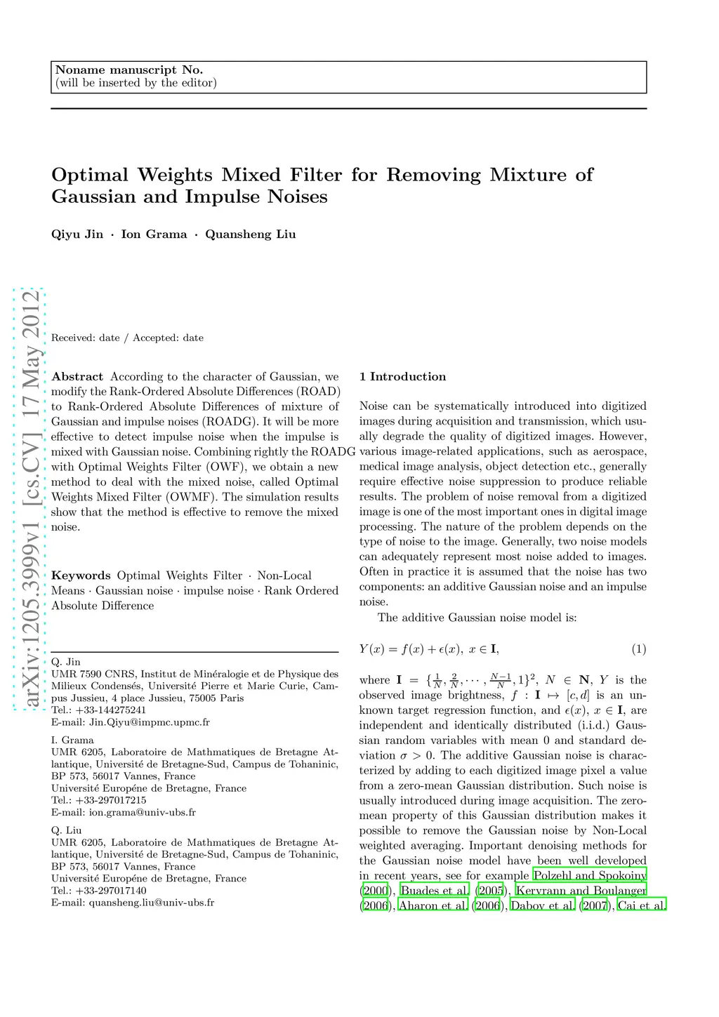 According to the character of Gaussian, we modify the Rank-Ordered Absolute Differences (ROAD) to Rank-Ordered Absolute Differences of mixture of Gaussian and impulse noises (ROADG). It will be more effective to detect impulse noise when the impulse is mixed with Gaussian noise. Combining rightly the ROADG with Optimal Weights Filter (OWF), we obtain a new method to deal with the mixed noise, called Optimal Weights Mixed Filter (OWMF). The simulation results show that the method is effective to remove the mixed noise.