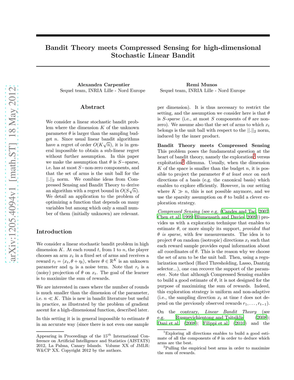 We consider a linear stochastic bandit problem where the dimension of the unknown parameter is larger than the sampling budget . In such cases, it is in general impossible to derive sub-linear regret bounds since usual linear bandit algorithms have a regret in . In this paper we assume that is sparse, i.e. has at most non-zero components, and that the space of arms is the unit ball for the norm. We combine ideas from Compressed Sensing and Bandit Theory and derive algorithms with regret bounds in .