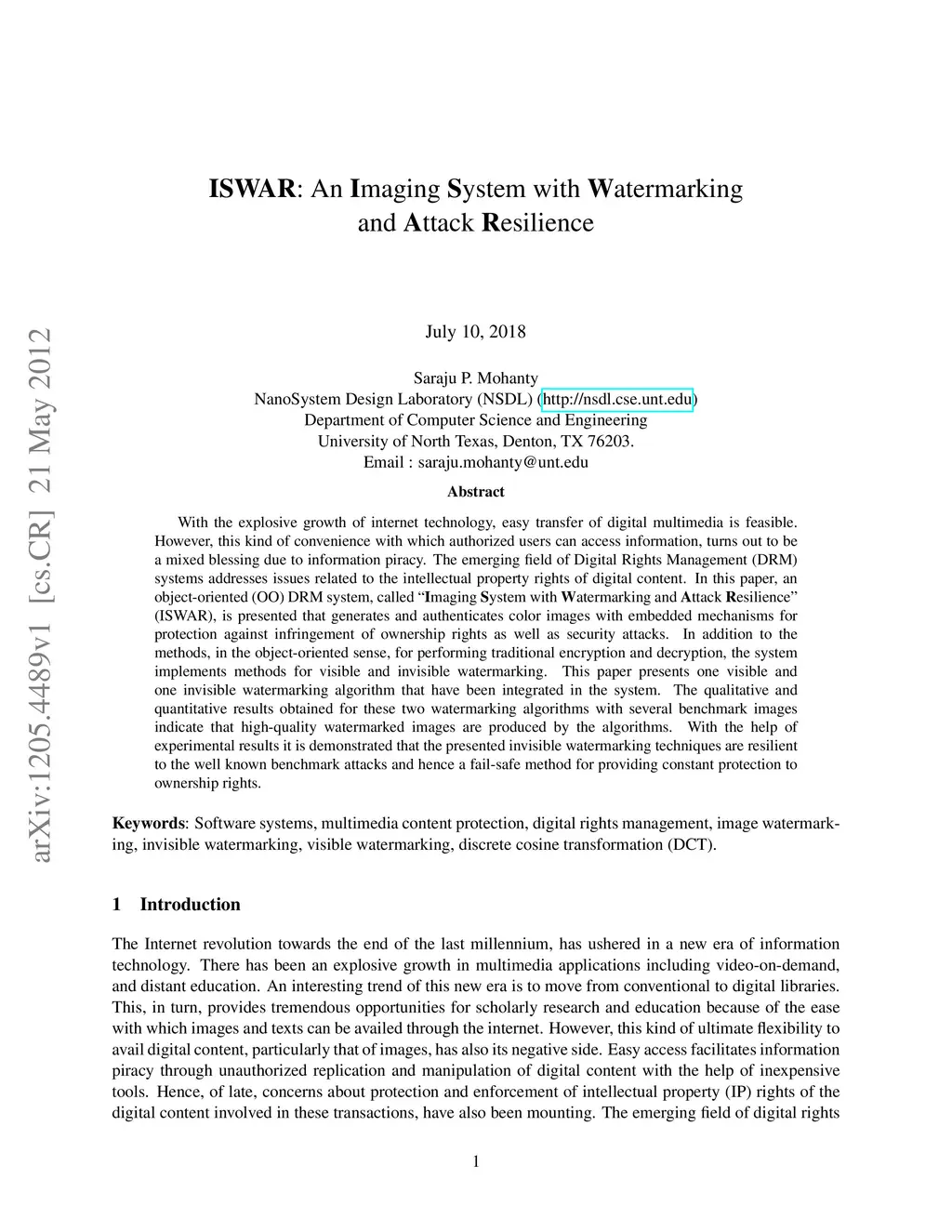With the explosive growth of internet technology, easy transfer of digital multimedia is feasible. However, this kind of convenience with which authorized users can access information, turns out to be a mixed blessing due to information piracy. The emerging field of Digital Rights Management (DRM) systems addresses issues related to the intellectual property rights of digital content. In this paper, an object-oriented (OO) DRM system, called "Imaging System with Watermarking and Attack Resilience" (ISWAR), is presented that generates and authenticates color images with embedded mechanisms for protection against infringement of ownership rights as well as security attacks. In addition to the methods, in the object-oriented sense, for performing traditional encryption and decryption, the system implements methods for visible and invisible watermarking. This paper presents one visible and one invisible watermarking algorithm that have been integrated in the system. The qualitative and quantitative results obtained for these two watermarking algorithms with several benchmark images indicate that high-quality watermarked images are produced by the algorithms. With the help of experimental results it is demonstrated that the presented invisible watermarking techniques are resilient to the well known benchmark attacks and hence a fail-safe method for providing constant protection to ownership rights.
