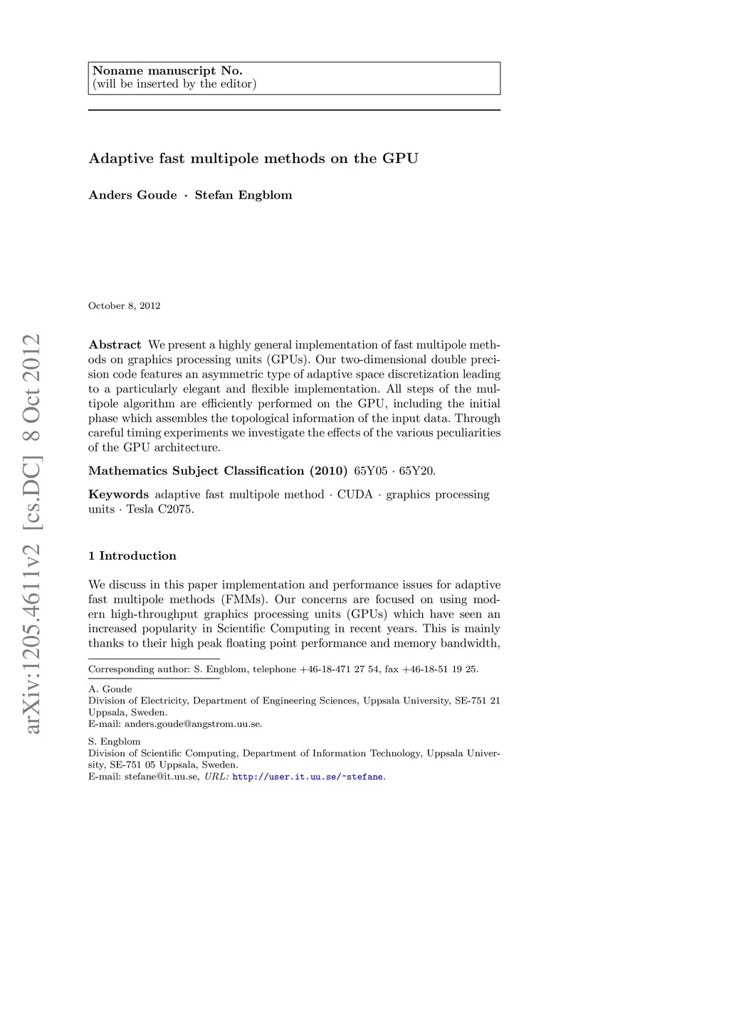 We present a highly general implementation of fast multipole methods on graphics processing units (GPUs). Our two-dimensional double precision code features an asymmetric type of adaptive space discretization leading to a particularly elegant and flexible implementation. All steps of the multipole algorithm are efficiently performed on the GPU, including the initial phase which assembles the topological information of the input data. Through careful timing experiments we investigate the effects of the various peculiarities of the GPU architecture.