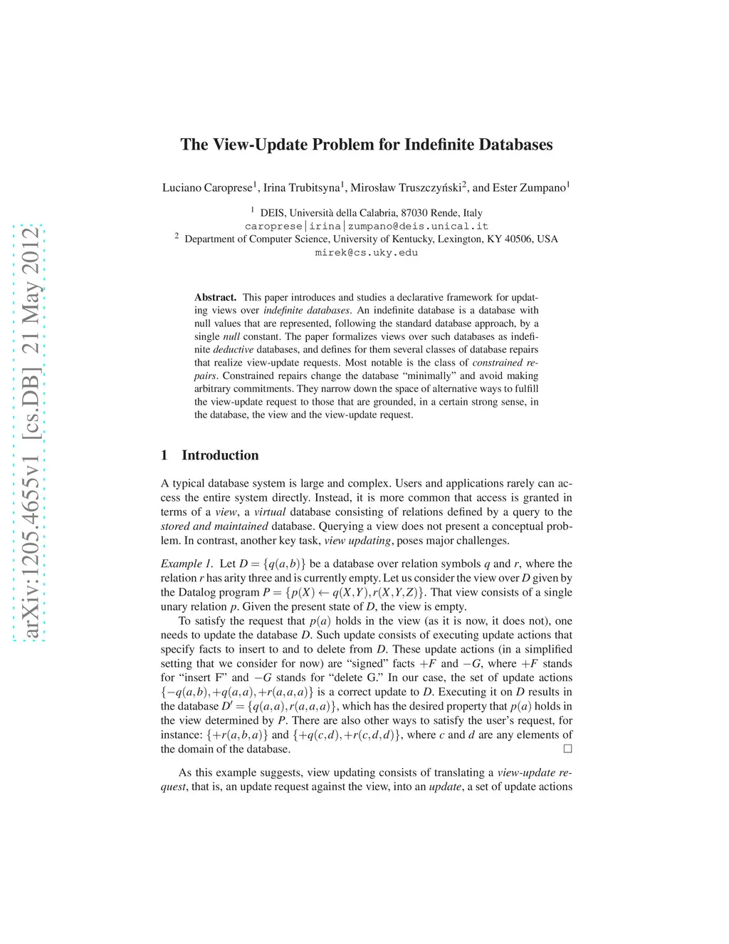 This paper introduces and studies a declarative framework for updating views over indefinite databases. An indefinite database is a database with null values that are represented, following the standard database approach, by a single null constant. The paper formalizes views over such databases as indefinite deductive databases, and defines for them several classes of database repairs that realize view-update requests. Most notable is the class of constrained repairs. Constrained repairs change the database "minimally" and avoid making arbitrary commitments. They narrow down the space of alternative ways to fulfill the view-update request to those that are grounded, in a certain strong sense, in the database, the view and the view-update request.
