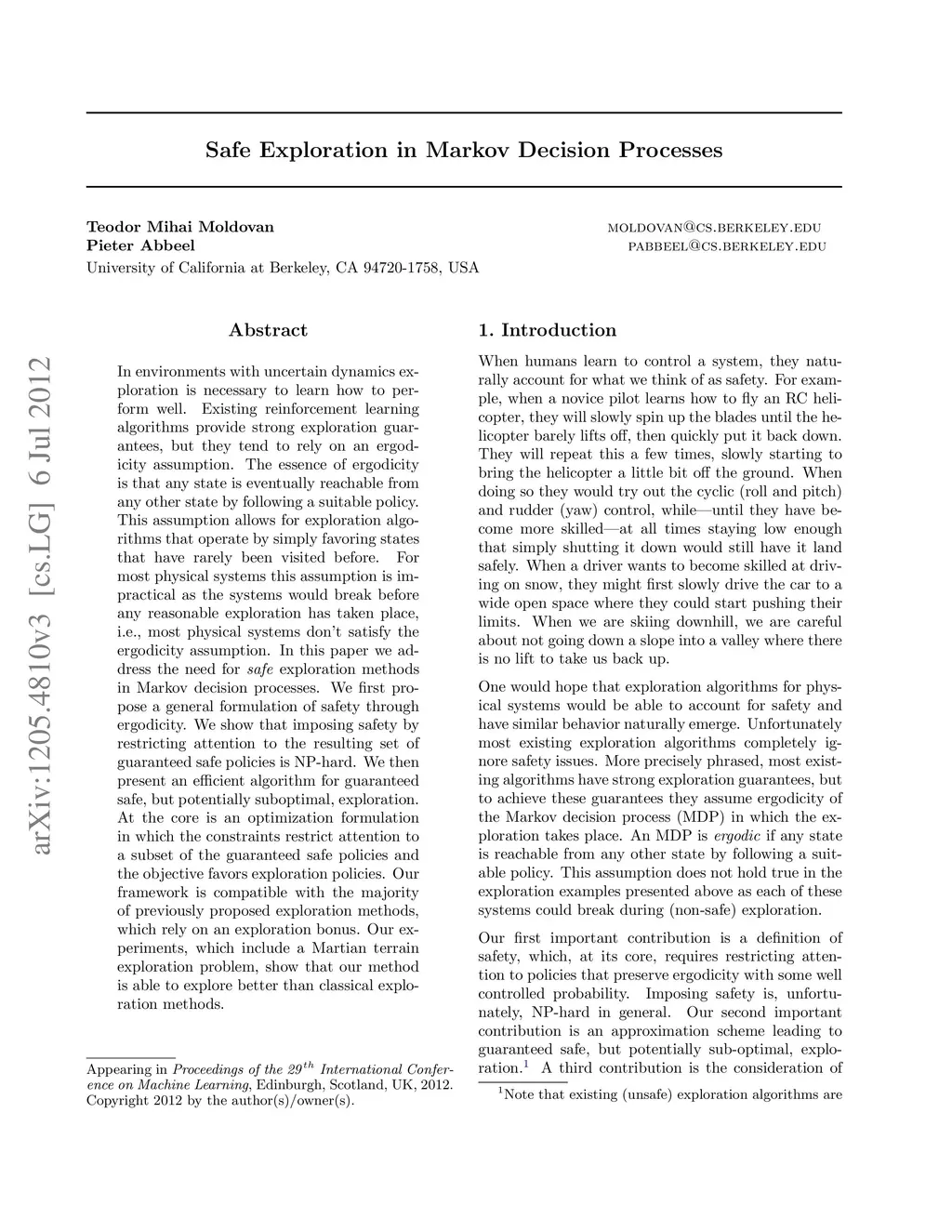 In environments with uncertain dynamics exploration is necessary to learn how to perform well. Existing reinforcement learning algorithms provide strong exploration guarantees, but they tend to rely on an ergodicity assumption. The essence of ergodicity is that any state is eventually reachable from any other state by following a suitable policy. This assumption allows for exploration algorithms that operate by simply favoring states that have rarely been visited before. For most physical systems this assumption is impractical as the systems would break before any reasonable exploration has taken place, i.e., most physical systems don't satisfy the ergodicity assumption. In this paper we address the need for safe exploration methods in Markov decision processes. We first propose a general formulation of safety through ergodicity. We show that imposing safety by restricting attention to the resulting set of guaranteed safe policies is NP-hard. We then present an efficient algorithm for guaranteed safe, but potentially suboptimal, exploration. At the core is an optimization formulation in which the constraints restrict attention to a subset of the guaranteed safe policies and the objective favors exploration policies. Our framework is compatible with the majority of previously proposed exploration methods, which rely on an exploration bonus. Our experiments, which include a Martian terrain exploration problem, show that our method is able to explore better than classical exploration methods.