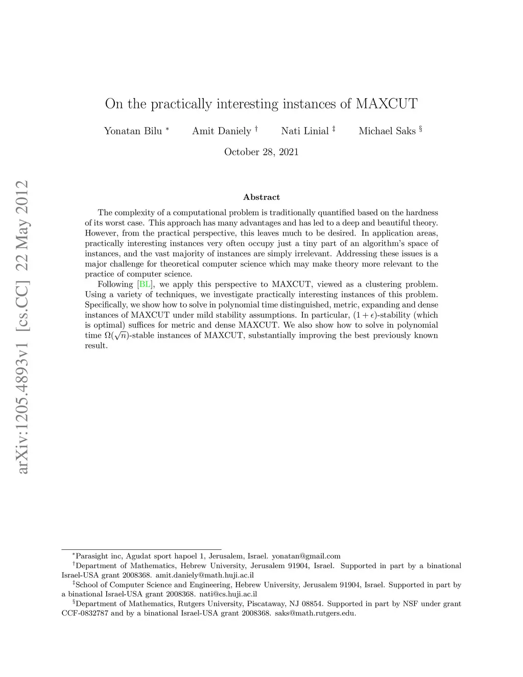 The complexity of a computational problem is traditionally quantified based on the hardness of its worst case. This approach has many advantages and has led to a deep and beautiful theory. However, from the practical perspective, this leaves much to be desired. In application areas, practically interesting instances very often occupy just a tiny part of an algorithm's space of instances, and the vast majority of instances are simply irrelevant. Addressing these issues is a major challenge for theoretical computer science which may make theory more relevant to the practice of computer science. Following Bilu and Linial, we apply this perspective to MAXCUT, viewed as a clustering problem. Using a variety of techniques, we investigate practically interesting instances of this problem. Specifically, we show how to solve in polynomial time distinguished, metric, expanding and dense instances of MAXCUT under mild stability assumptions. In particular, -stability (which is optimal) suffices for metric and dense MAXCUT. We also show how to solve in polynomial time -stable instances of MAXCUT, substantially improving the best previously known result.