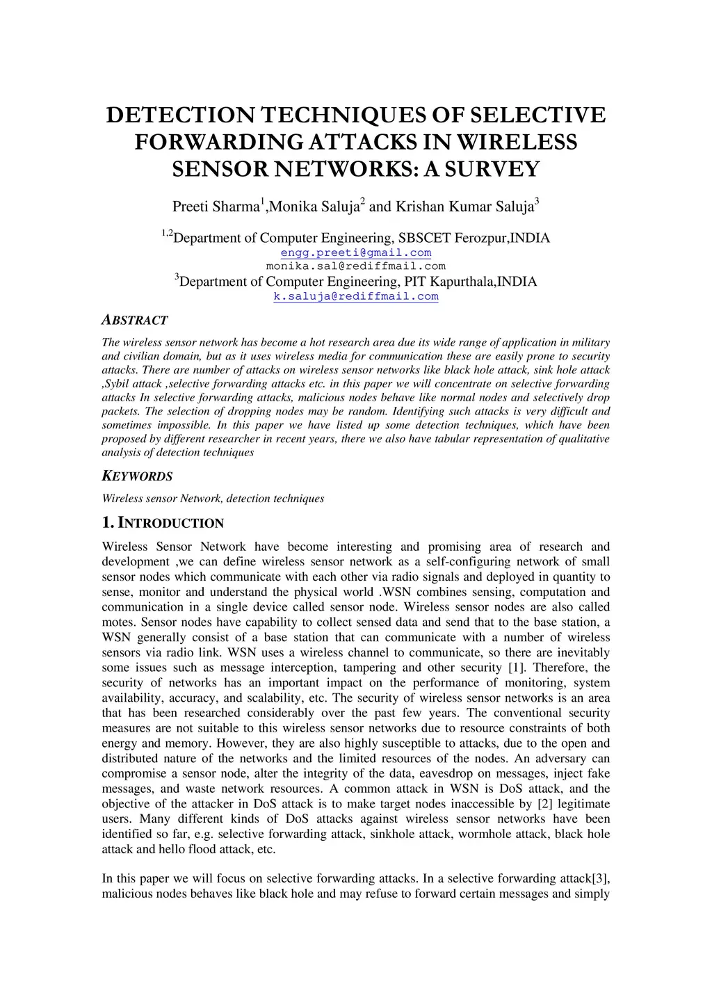 The wireless sensor network has become a hot research area due its wide range of application in military and civilian domain, but as it uses wireless media for communication these are easily prone to security attacks. There are number of attacks on wireless sensor networks like black hole attack, sink hole attack, Sybil attack, selective forwarding attacks etc. in this paper we will concentrate on selective forwarding attacks In selective forwarding attacks, malicious nodes behave like normal nodes and selectively drop packets. The selection of dropping nodes may be random. Identifying such attacks is very difficult and sometimes impossible. In this paper we have listed up some detection techniques, which have been proposed by different researcher in recent years, there we also have tabular representation of qualitative analysis of detection techniques