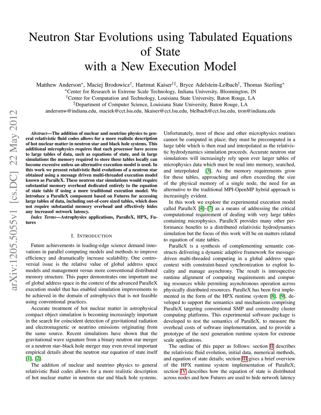The addition of nuclear and neutrino physics to general relativistic fluid codes allows for a more realistic description of hot nuclear matter in neutron star and black hole systems. This additional microphysics requires that each processor have access to large tables of data, such as equations of state, and in large simulations the memory required to store these tables locally can become excessive unless an alternative execution model is used. In this work we present relativistic fluid evolutions of a neutron star obtained using a message driven multi-threaded execution model known as ParalleX. These neutron star simulations would require substantial memory overhead dedicated entirely to the equation of state table if using a more traditional execution model. We introduce a ParalleX component based on Futures for accessing large tables of data, including out-of-core sized tables, which does not require substantial memory overhead and effectively hides any increased network latency.