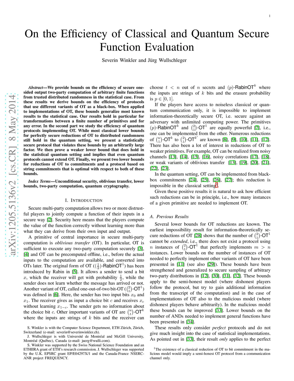 We provide bounds on the efficiency of secure one-sided output two-party computation of arbitrary finite functions from trusted distributed randomness in the statistical case. From these results we derive bounds on the efficiency of protocols that use different variants of OT as a black-box. When applied to implementations of OT, these bounds generalize most known results to the statistical case. Our results hold in particular for transformations between a finite number of primitives and for any error. In the second part we study the efficiency of quantum protocols implementing OT. While most classical lower bounds for perfectly secure reductions of OT to distributed randomness still hold in the quantum setting, we present a statistically secure protocol that violates these bounds by an arbitrarily large factor. We then prove a weaker lower bound that does hold in the statistical quantum setting and implies that even quantum protocols cannot extend OT. Finally, we present two lower bounds for reductions of OT to commitments and a protocol based on string commitments that is optimal with respect to both of these bounds.