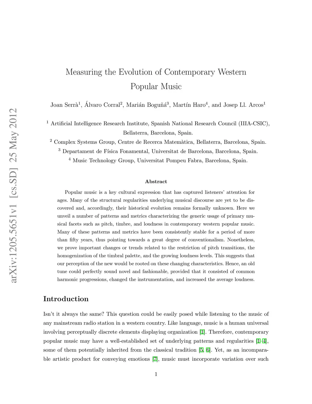 Popular music is a key cultural expression that has captured listeners' attention for ages. Many of the structural regularities underlying musical discourse are yet to be discovered and, accordingly, their historical evolution remains formally unknown. Here we unveil a number of patterns and metrics characterizing the generic usage of primary musical facets such as pitch, timbre, and loudness in contemporary western popular music. Many of these patterns and metrics have been consistently stable for a period of more than fifty years, thus pointing towards a great degree of conventionalism. Nonetheless, we prove important changes or trends related to the restriction of pitch transitions, the homogenization of the timbral palette, and the growing loudness levels. This suggests that our perception of the new would be rooted on these changing characteristics. Hence, an old tune could perfectly sound novel and fashionable, provided that it consisted of common harmonic progressions, changed the instrumentation, and increased the average loudness.