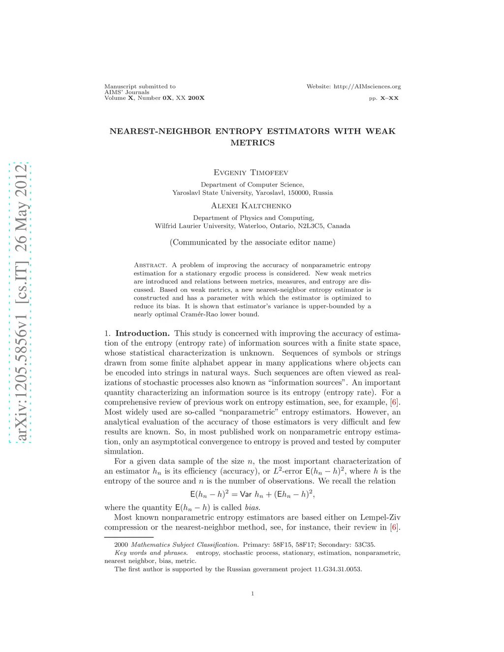 A problem of improving the accuracy of nonparametric entropy estimation for a stationary ergodic process is considered. New weak metrics are introduced and relations between metrics, measures, and entropy are discussed. Based on weak metrics, a new nearest-neighbor entropy estimator is constructed and has a parameter with which the estimator is optimized to reduce its bias. It is shown that estimator's variance is upper-bounded by a nearly optimal Cramer-Rao lower bound.