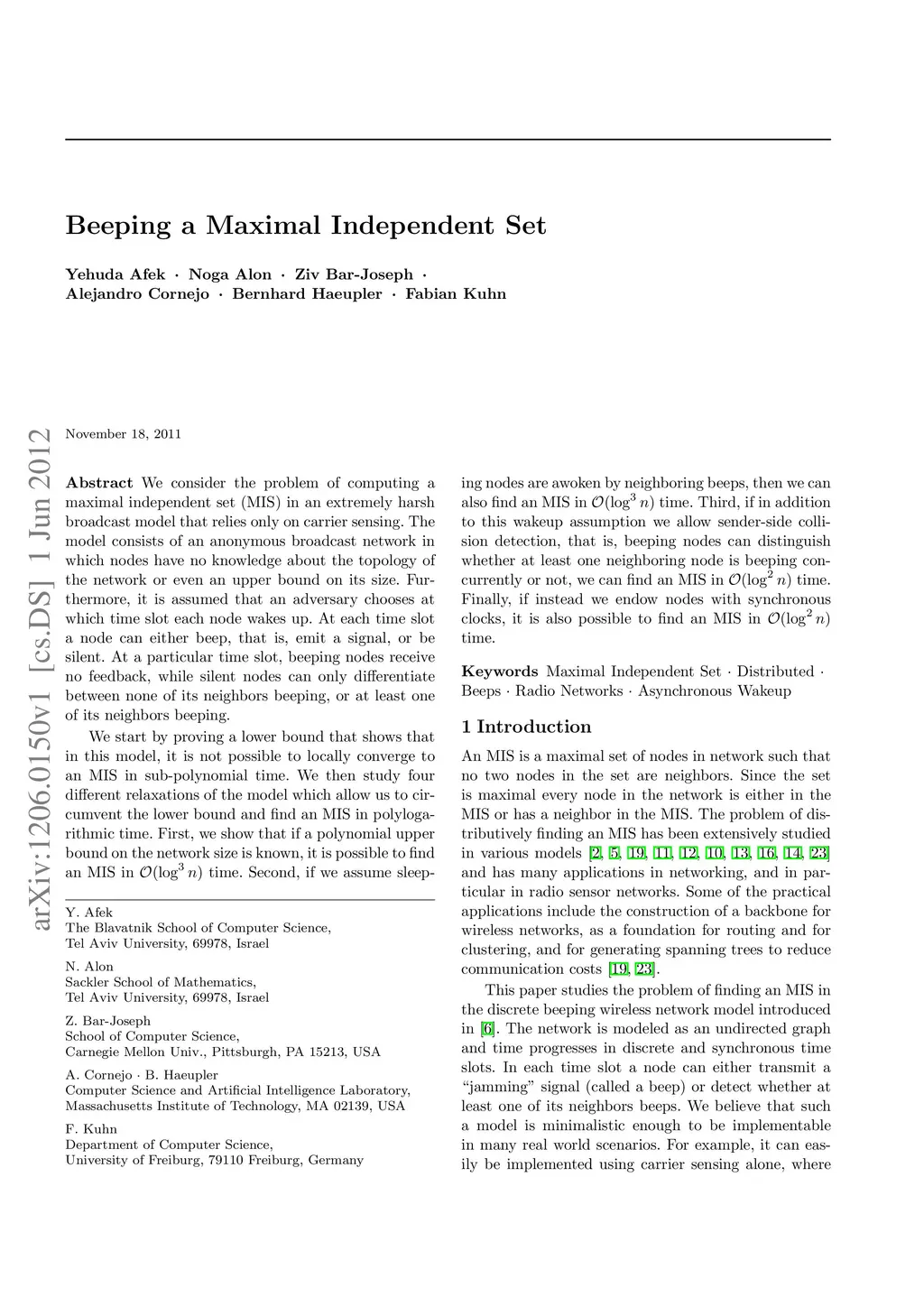 We consider the problem of computing a maximal independent set (MIS) in an extremely harsh broadcast model that relies only on carrier sensing. The model consists of an anonymous broadcast network in which nodes have no knowledge about the topology of the network or even an upper bound on its size. Furthermore, it is assumed that an adversary chooses at which time slot each node wakes up. At each time slot a node can either beep, that is, emit a signal, or be silent. At a particular time slot, beeping nodes receive no feedback, while silent nodes can only differentiate between none of its neighbors beeping, or at least one of its neighbors beeping. We start by proving a lower bound that shows that in this model, it is not possible to locally converge to an MIS in sub-polynomial time. We then study four different relaxations of the model which allow us to circumvent the lower bound and find an MIS in polylogarithmic time. First, we show that if a polynomial upper bound on the network size is known, it is possible to find an MIS in O(log^3 n) time. Second, if we assume sleeping nodes are awoken by neighboring beeps, then we can also find an MIS in O(log^3 n) time. Third, if in addition to this wakeup assumption we allow sender-side collision detection, that is, beeping nodes can distinguish whether at least one neighboring node is beeping concurrently or not, we can find an MIS in O(log^2 n) time. Finally, if instead we endow nodes with synchronous clocks, it is also possible to find an MIS in O(log^2 n) time.