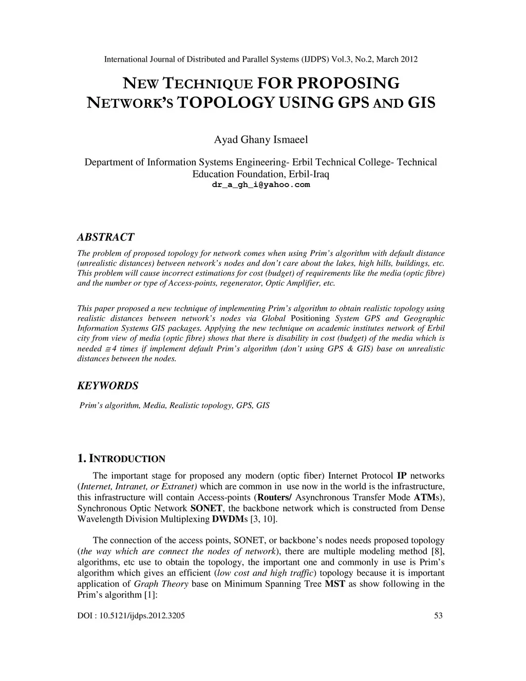 The problem of proposed topology for network comes when using Prim's algorithm with default distance (unrealistic distances) between network's nodes and don't care about the lakes, high hills, buildings, etc. This problem will cause incorrect estimations for cost (budget) of requirements like the media (optic fibre) and the number or type of Access-points, regenerator, Optic Amplifier, etc. This paper proposed a new technique of implementing Prim's algorithm to obtain realistic topology using realistic distances between network's nodes via Global Positioning System GPS and Geographic Information Systems GIS packages. Applying the new technique on academic institutes network of Erbil city from view of media (optic fibre) shows that there is disability in cost (budget) of the media which is needed (nearly) 4 times if implement default Prim's algorithm (don't using GPS & GIS) base on unrealistic distances between the nodes.