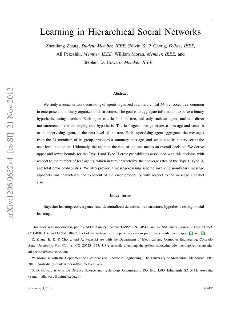 We study a social network consisting of agents organized as a hierarchical M-ary rooted tree, common in enterprise and military organizational structures. The goal is to aggregate information to solve a binary hypothesis testing problem. Each agent at a leaf of the tree, and only such an agent, makes a direct measurement of the underlying true hypothesis. The leaf agent then makes a decision and sends it to its supervising agent, at the next level of the tree. Each supervising agent aggregates the decisions from the M members of its group, produces a summary message, and sends it to its supervisor at the next level, and so on. Ultimately, the agent at the root of the tree makes an overall decision. We derive upper and lower bounds for the Type I and II error probabilities associated with this decision with respect to the number of leaf agents, which in turn characterize the converge rates of the Type I, Type II, and total error probabilities. We also provide a message-passing scheme involving non-binary message alphabets and characterize the exponent of the error probability with respect to the message alphabet size.