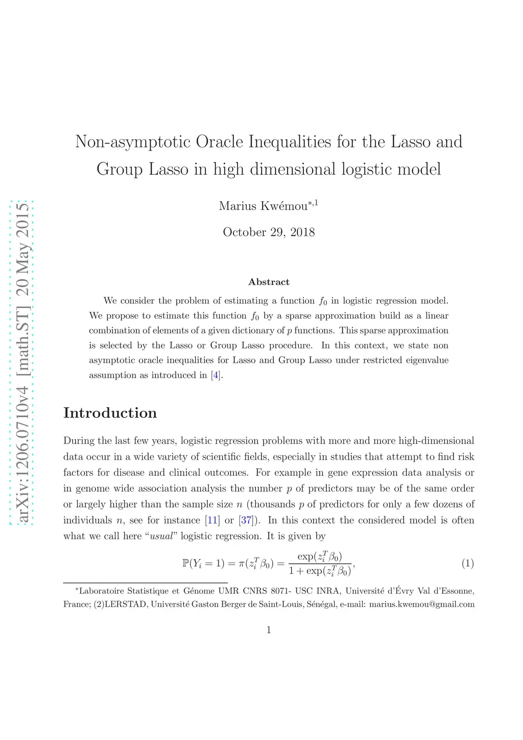 We consider the problem of estimating a function in logistic regression model. We propose to estimate this function by a sparse approximation build as a linear combination of elements of a given dictionary of functions. This sparse approximation is selected by the Lasso or Group Lasso procedure. In this context, we state non asymptotic oracle inequalities for Lasso and Group Lasso under restricted eigenvalues assumption as introduced in \cite{BRT}.