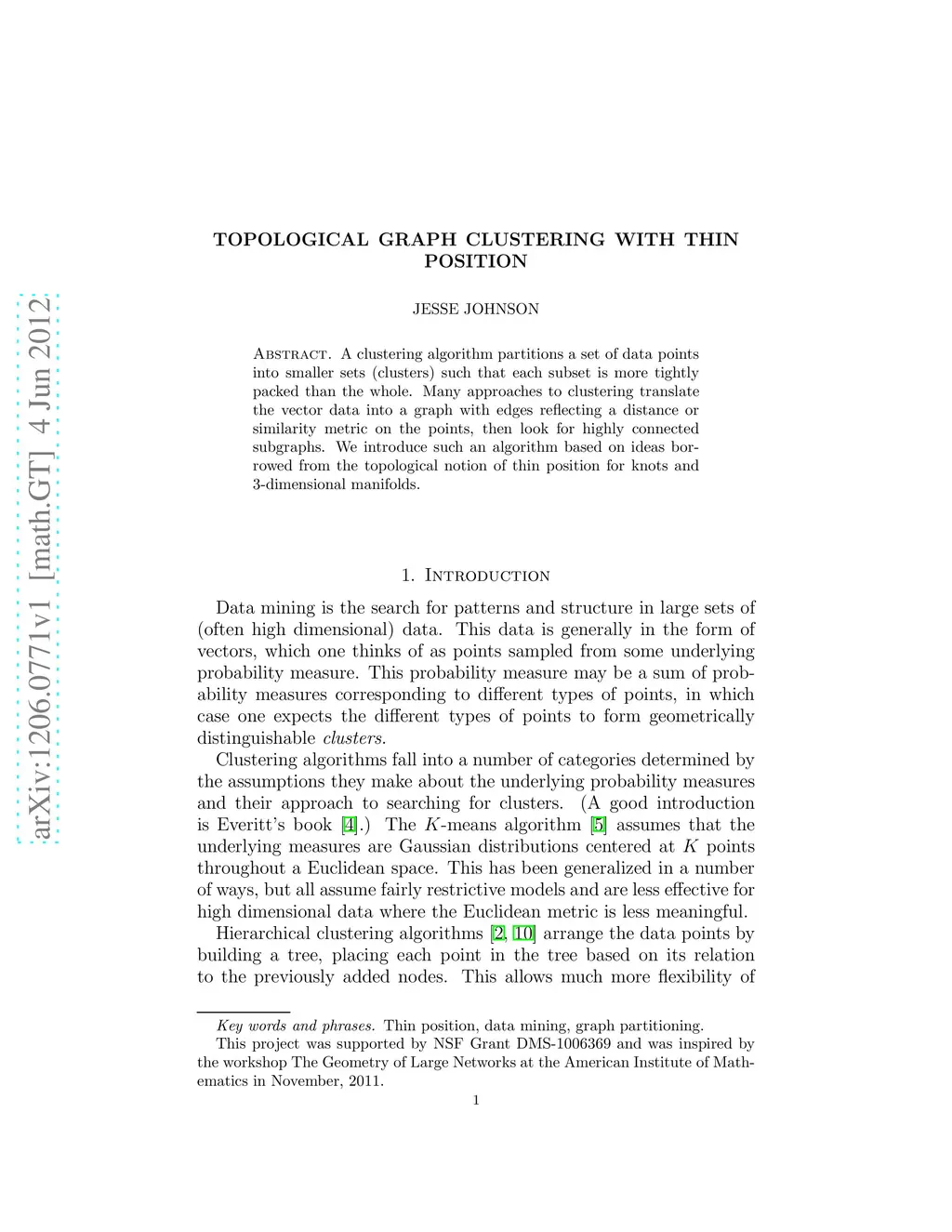 A clustering algorithm partitions a set of data points into smaller sets (clusters) such that each subset is more tightly packed than the whole. Many approaches to clustering translate the vector data into a graph with edges reflecting a distance or similarity metric on the points, then look for highly connected subgraphs. We introduce such an algorithm based on ideas borrowed from the topological notion of thin position for knots and 3-dimensional manifolds.