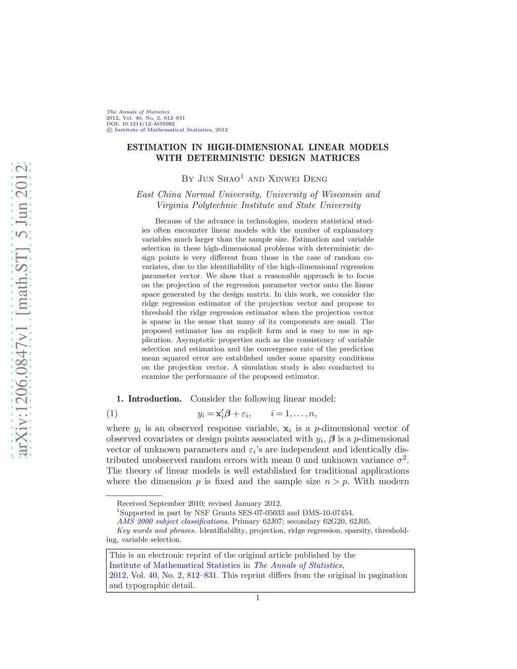 Because of the advance in technologies, modern statistical studies often encounter linear models with the number of explanatory variables much larger than the sample size. Estimation and variable selection in these high-dimensional problems with deterministic design points is very different from those in the case of random covariates, due to the identifiability of the high-dimensional regression parameter vector. We show that a reasonable approach is to focus on the projection of the regression parameter vector onto the linear space generated by the design matrix. In this work, we consider the ridge regression estimator of the projection vector and propose to threshold the ridge regression estimator when the projection vector is sparse in the sense that many of its components are small. The proposed estimator has an explicit form and is easy to use in application. Asymptotic properties such as the consistency of variable selection and estimation and the convergence rate of the prediction mean squared error are established under some sparsity conditions on the projection vector. A simulation study is also conducted to examine the performance of the proposed estimator.