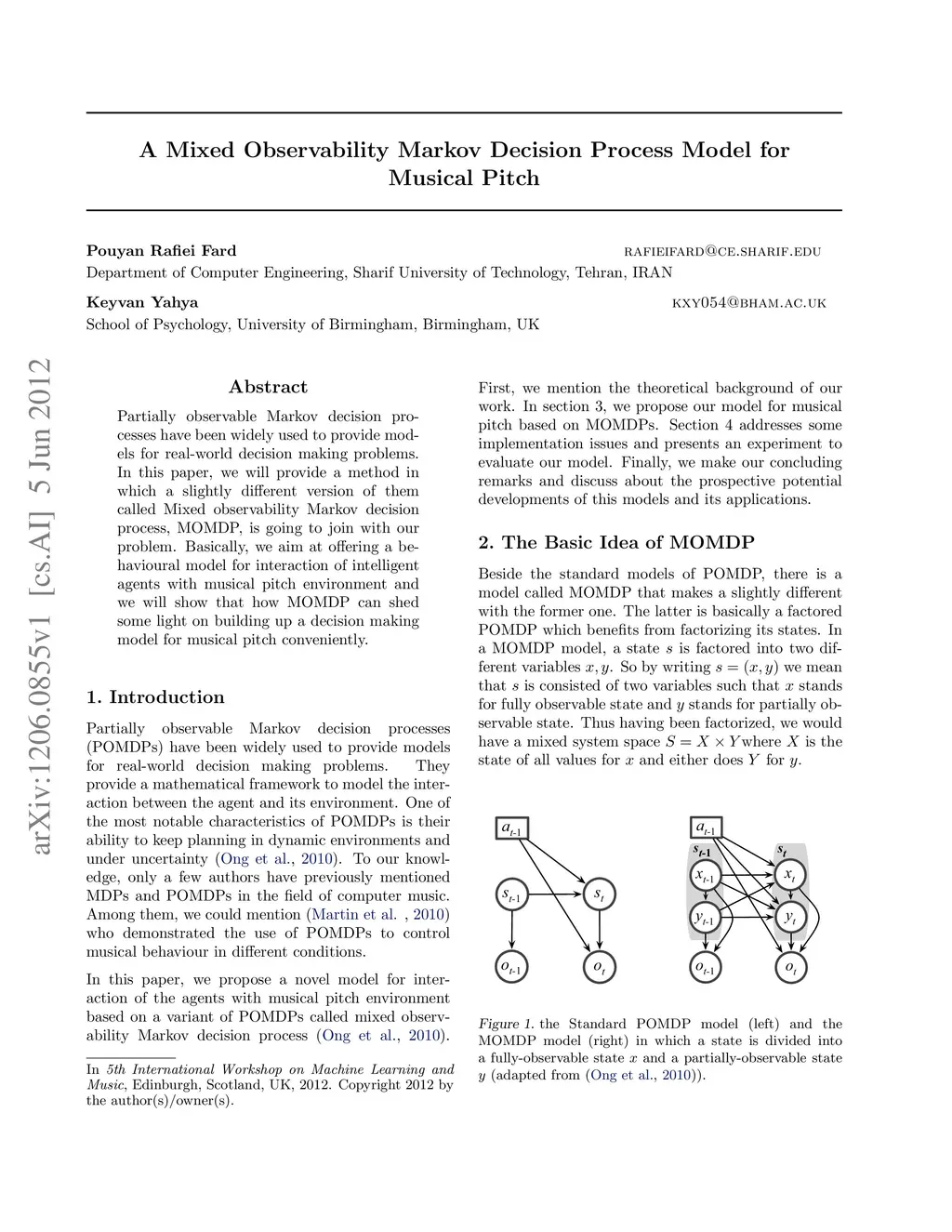 Partially observable Markov decision processes have been widely used to provide models for real-world decision making problems. In this paper, we will provide a method in which a slightly different version of them called Mixed observability Markov decision process, MOMDP, is going to join with our problem. Basically, we aim at offering a behavioural model for interaction of intelligent agents with musical pitch environment and we will show that how MOMDP can shed some light on building up a decision making model for musical pitch conveniently.