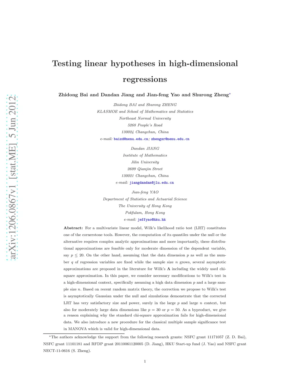 For a multivariate linear model, Wilk's likelihood ratio test (LRT) constitutes one of the cornerstone tools. However, the computation of its quantiles under the null or the alternative requires complex analytic approximations and more importantly, these distributional approximations are feasible only for moderate dimension of the dependent variable, say . On the other hand, assuming that the data dimension as well as the number of regression variables are fixed while the sample size grows, several asymptotic approximations are proposed in the literature for Wilk's including the widely used chi-square approximation. In this paper, we consider necessary modifications to Wilk's test in a high-dimensional context, specifically assuming a high data dimension and a large sample size . Based on recent random matrix theory, the correction we propose to Wilk's test is asymptotically Gaussian under the null and simulations demonstrate that the corrected LRT has very satisfactory size and power, surely in the large and large context, but also for moderately large data dimensions like or . As a byproduct, we give a reason explaining why the standard chi-square approximation fails for high-dimensional data. We also introduce a new procedure for the classical multiple sample significance test in MANOVA which is valid for high-dimensional data.