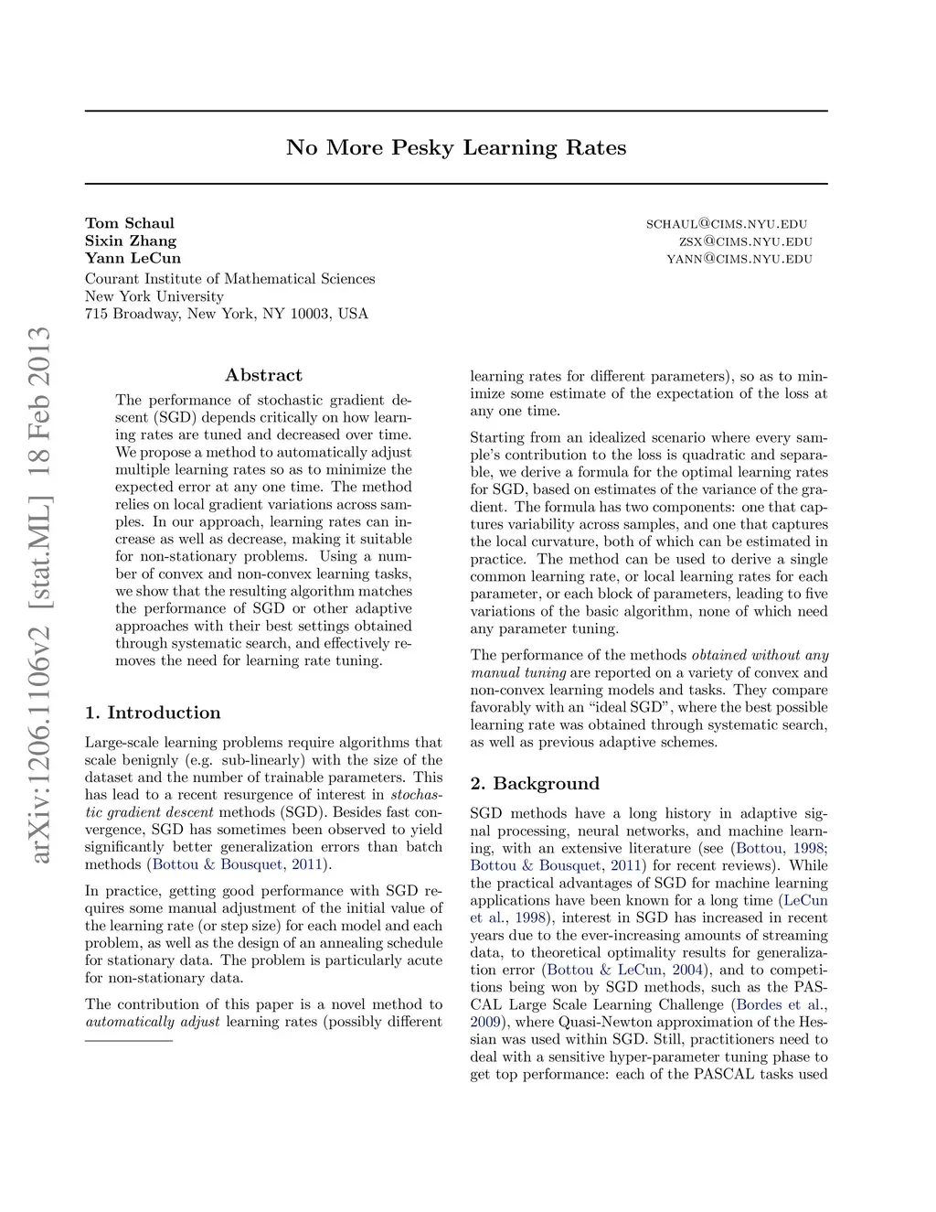 The performance of stochastic gradient descent (SGD) depends critically on how learning rates are tuned and decreased over time. We propose a method to automatically adjust multiple learning rates so as to minimize the expected error at any one time. The method relies on local gradient variations across samples. In our approach, learning rates can increase as well as decrease, making it suitable for non-stationary problems. Using a number of convex and non-convex learning tasks, we show that the resulting algorithm matches the performance of SGD or other adaptive approaches with their best settings obtained through systematic search, and effectively removes the need for learning rate tuning.