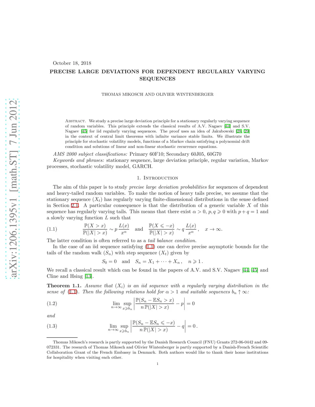 We study a precise large deviation principle for a stationary regularly varying sequence of random variables. This principle extends the classical results of A.V. Nagaev (1969) and S.V. Nagaev (1979) for iid regularly varying sequences. The proof uses an idea of Jakubowski (1993,1997) in the context of centra limit theorems with infinite variance stable limits. We illustrate the principle for \sv\ models, functions of a Markov chain satisfying a polynomial drift condition and solutions of linear and non-linear stochastic recurrence equations.