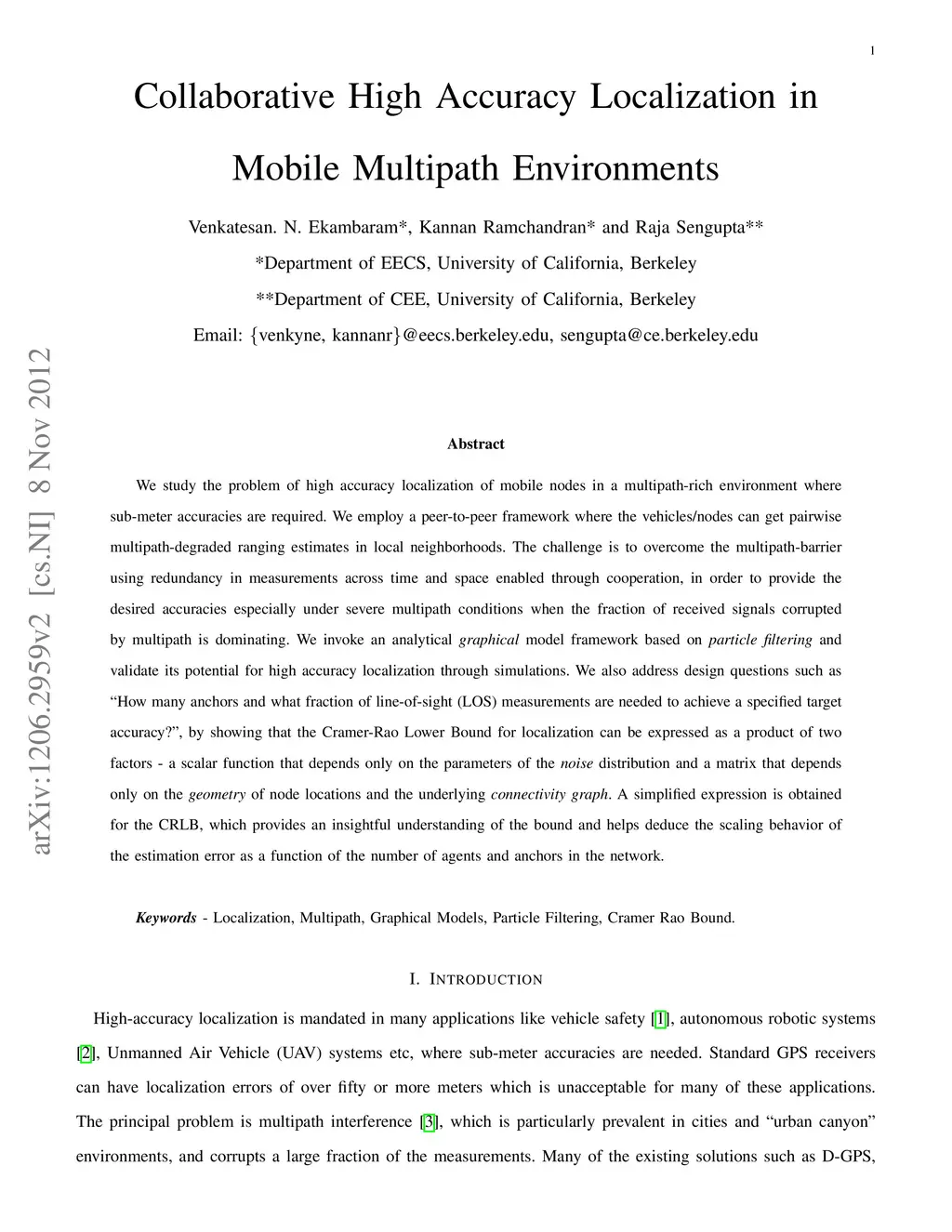 We study the problem of high accuracy localization of mobile nodes in a multipath-rich environment where sub-meter accuracies are required. We employ a peer-to-peer framework where the vehicles/nodes can get pairwise multipath-degraded ranging estimates in local neighborhoods together with a fixed number of anchor nodes. The challenge is to overcome the multipath-barrier with redundancy in order to provide the desired accuracies especially under severe multipath conditions when the fraction of received signals corrupted by multipath is dominating. We invoke a analytical graphical model framework based on particle filtering and reveal its high accuracy localization promise through simulations. We also address design questions such as "How many anchors and what fraction of line-of-sight (LOS) measurements are needed to achieve a specified target accuracy?", by analytically characterizing the performance improvement in localization accuracy as a function of the number of nodes in the network and the fraction of LOS measurements. In particular, for a static node placement, we show that the Cramer-Rao Lower Bound (CRLB), a fundamental lower bound on the localization accuracy, can be expressed as a product of two factors - a scalar function that depends only on the parameters of the noise distribution and a matrix that depends only on the geometry of node locations and the underlying connectivity graph. Further, a simplified expression is obtained for the CRLB that helps deduce the scaling behavior of the estimation error as a function of the number of agents and anchors in the network. The bound suggests that even a small fraction of LOS measurements can provide significant improvements. Conversely, a small fraction of NLOS measurements can significantly degrade the performance. The analysis is extended to the mobile setting and the performance is compared with the derived CRLB.
