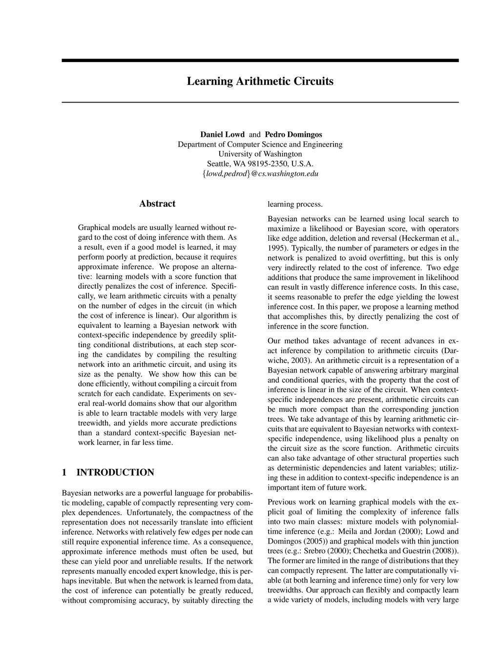 Graphical models are usually learned without regard to the cost of doing inference with them. As a result, even if a good model is learned, it may perform poorly at prediction, because it requires approximate inference. We propose an alternative: learning models with a score function that directly penalizes the cost of inference. Specifically, we learn arithmetic circuits with a penalty on the number of edges in the circuit (in which the cost of inference is linear). Our algorithm is equivalent to learning a Bayesian network with context-specific independence by greedily splitting conditional distributions, at each step scoring the candidates by compiling the resulting network into an arithmetic circuit, and using its size as the penalty. We show how this can be done efficiently, without compiling a circuit from scratch for each candidate. Experiments on several real-world domains show that our algorithm is able to learn tractable models with very large treewidth, and yields more accurate predictions than a standard context-specific Bayesian network learner, in far less time.