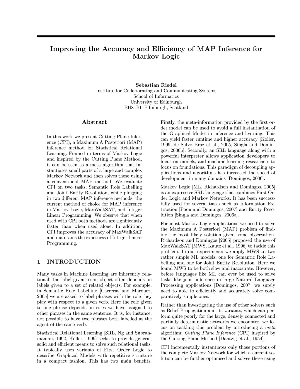 In this work we present Cutting Plane Inference (CPI), a Maximum A Posteriori (MAP) inference method for Statistical Relational Learning. Framed in terms of Markov Logic and inspired by the Cutting Plane Method, it can be seen as a meta algorithm that instantiates small parts of a large and complex Markov Network and then solves these using a conventional MAP method. We evaluate CPI on two tasks, Semantic Role Labelling and Joint Entity Resolution, while plugging in two different MAP inference methods: the current method of choice for MAP inference in Markov Logic, MaxWalkSAT, and Integer Linear Programming. We observe that when used with CPI both methods are significantly faster than when used alone. In addition, CPI improves the accuracy of MaxWalkSAT and maintains the exactness of Integer Linear Programming.