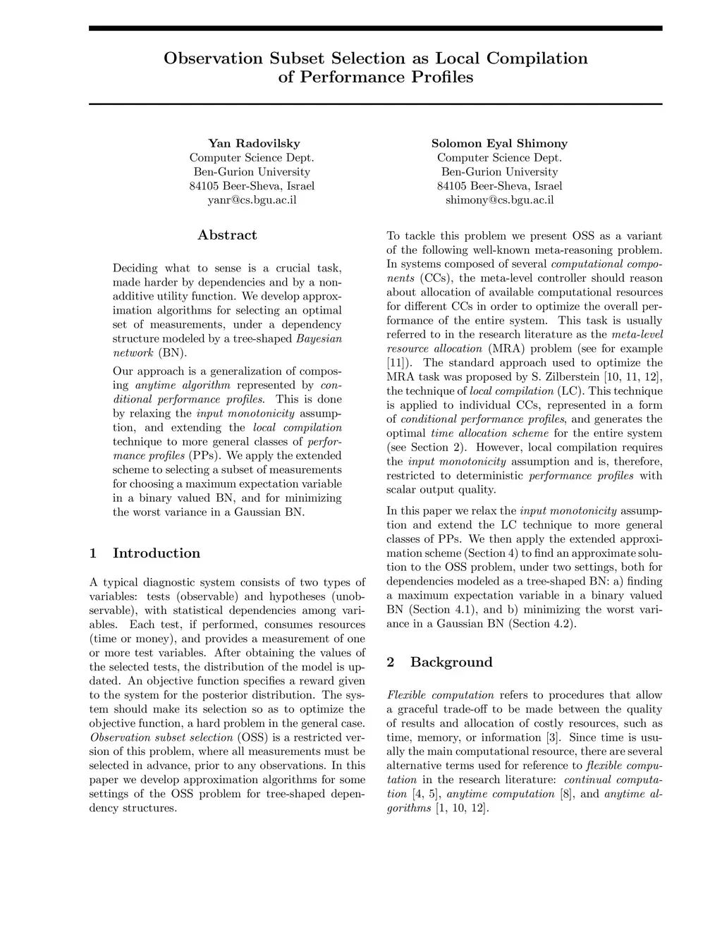 Deciding what to sense is a crucial task, made harder by dependencies and by a nonadditive utility function. We develop approximation algorithms for selecting an optimal set of measurements, under a dependency structure modeled by a tree-shaped Bayesian network (BN). Our approach is a generalization of composing anytime algorithm represented by conditional performance profiles. This is done by relaxing the input monotonicity assumption, and extending the local compilation technique to more general classes of performance profiles (PPs). We apply the extended scheme to selecting a subset of measurements for choosing a maximum expectation variable in a binary valued BN, and for minimizing the worst variance in a Gaussian BN.