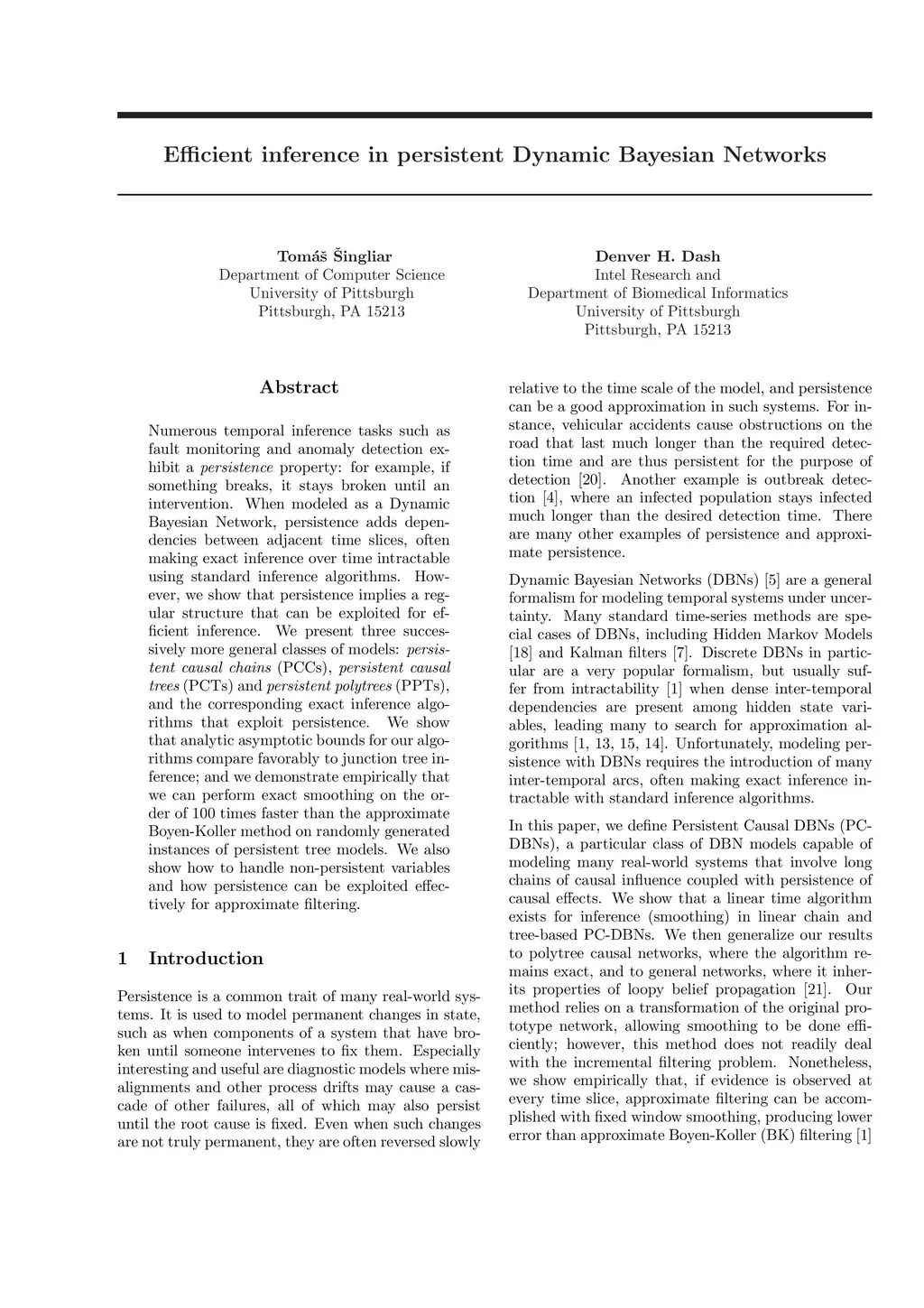 Numerous temporal inference tasks such as fault monitoring and anomaly detection exhibit a persistence property: for example, if something breaks, it stays broken until an intervention. When modeled as a Dynamic Bayesian Network, persistence adds dependencies between adjacent time slices, often making exact inference over time intractable using standard inference algorithms. However, we show that persistence implies a regular structure that can be exploited for efficient inference. We present three successively more general classes of models: persistent causal chains (PCCs), persistent causal trees (PCTs) and persistent polytrees (PPTs), and the corresponding exact inference algorithms that exploit persistence. We show that analytic asymptotic bounds for our algorithms compare favorably to junction tree inference; and we demonstrate empirically that we can perform exact smoothing on the order of 100 times faster than the approximate Boyen-Koller method on randomly generated instances of persistent tree models. We also show how to handle non-persistent variables and how persistence can be exploited effectively for approximate filtering.