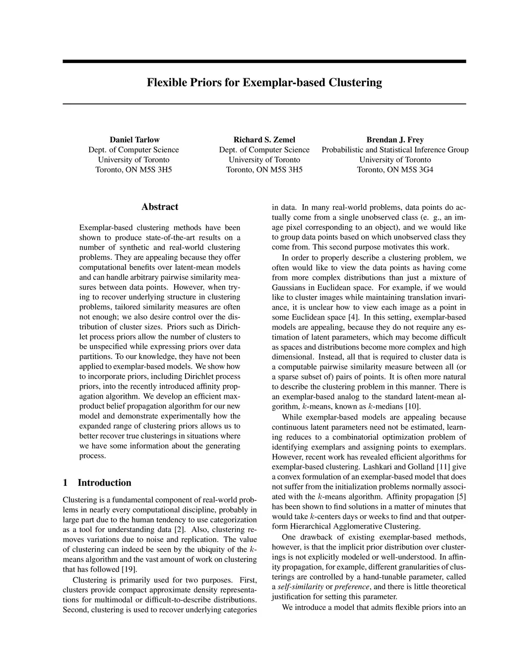 Exemplar-based clustering methods have been shown to produce state-of-the-art results on a number of synthetic and real-world clustering problems. They are appealing because they offer computational benefits over latent-mean models and can handle arbitrary pairwise similarity measures between data points. However, when trying to recover underlying structure in clustering problems, tailored similarity measures are often not enough; we also desire control over the distribution of cluster sizes. Priors such as Dirichlet process priors allow the number of clusters to be unspecified while expressing priors over data partitions. To our knowledge, they have not been applied to exemplar-based models. We show how to incorporate priors, including Dirichlet process priors, into the recently introduced affinity propagation algorithm. We develop an efficient maxproduct belief propagation algorithm for our new model and demonstrate experimentally how the expanded range of clustering priors allows us to better recover true clusterings in situations where we have some information about the generating process.